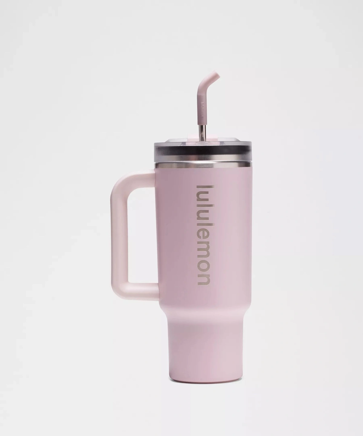 Pink travel mug. Features a handle and a silicone straw cover. Keeps drinks hot or cold. Brand new and unused, just doesn’t have tags attached anymore.
