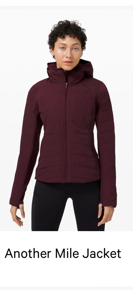 1000+Lululemon another mile jacket with a zipper and a hood. It is quilted throughout the jacket. The colour is burgundy. Size 10