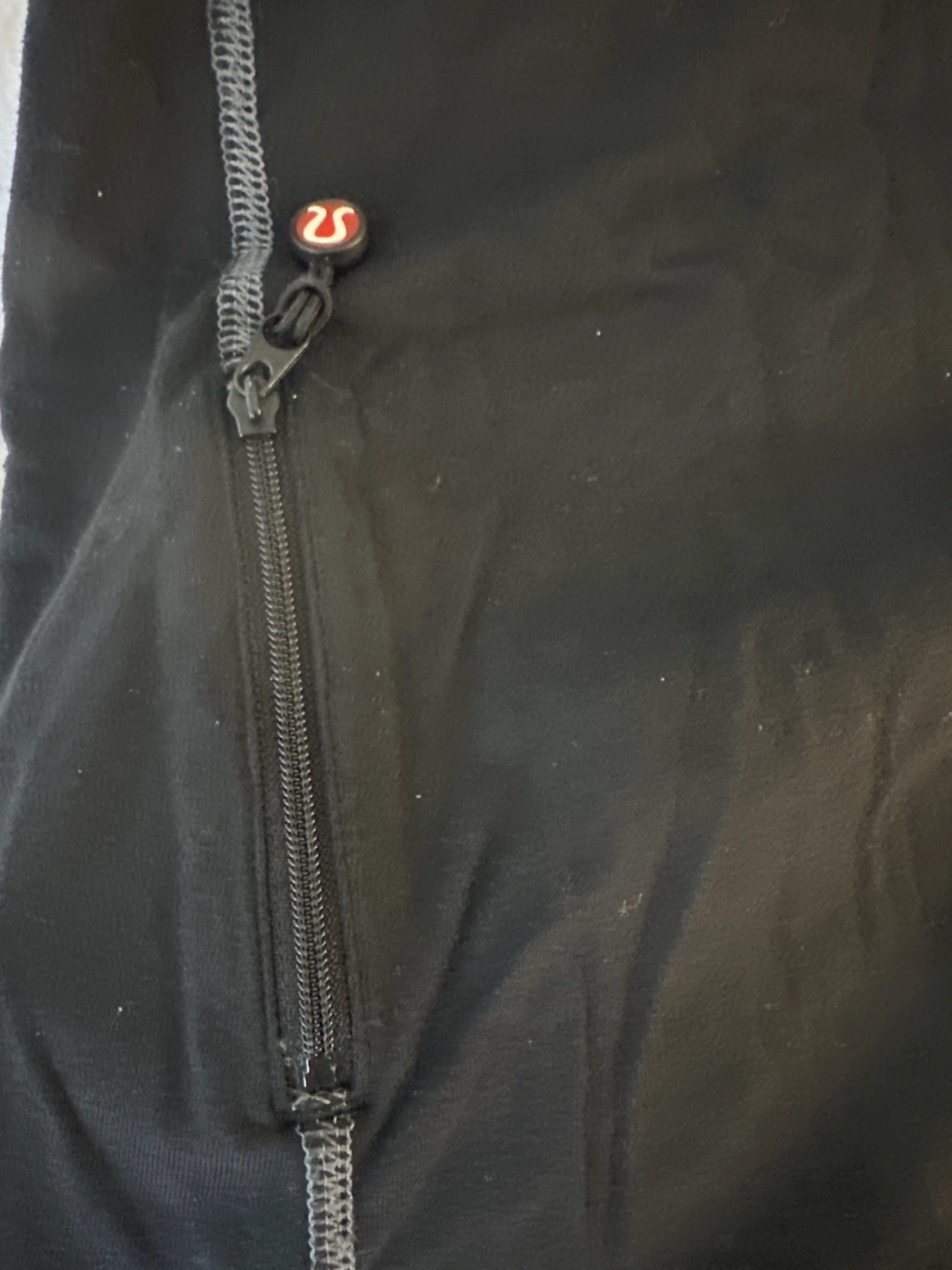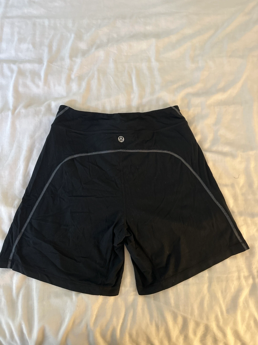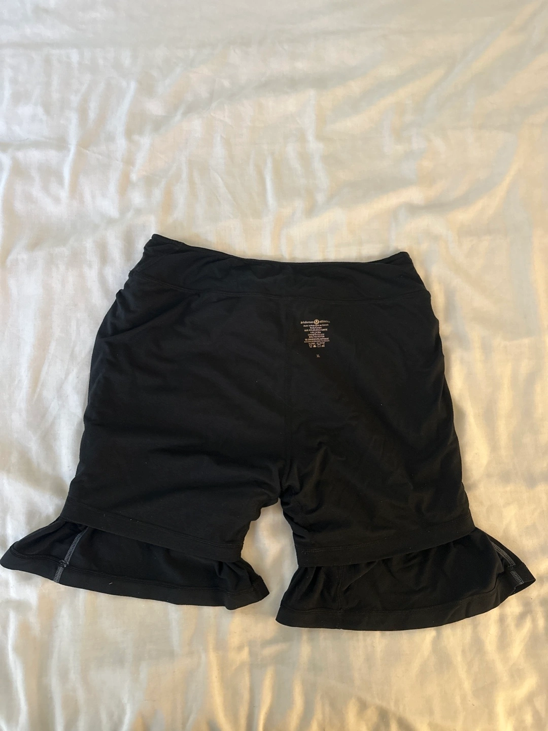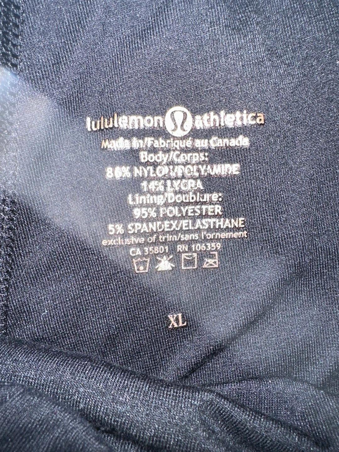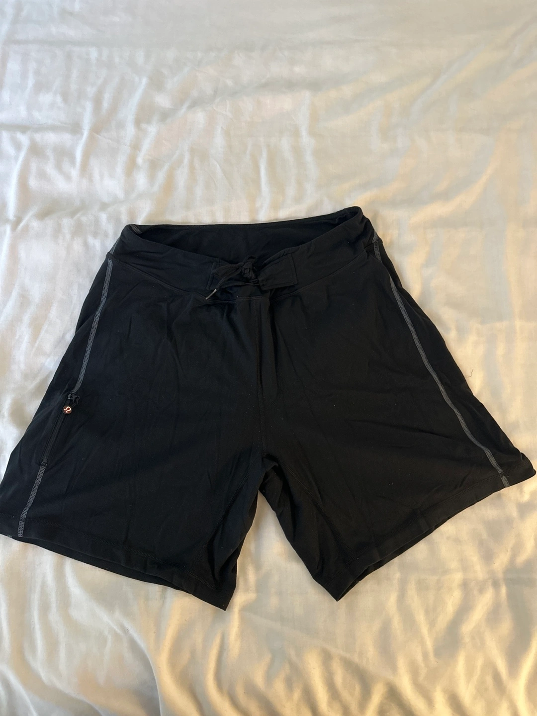 Black running shorts. Size XL. Drawstring waist. Side zip pocket. Made in Canada. 88% nylon, 12% Lycra. Lining: 95% polyester, 5% spandex.