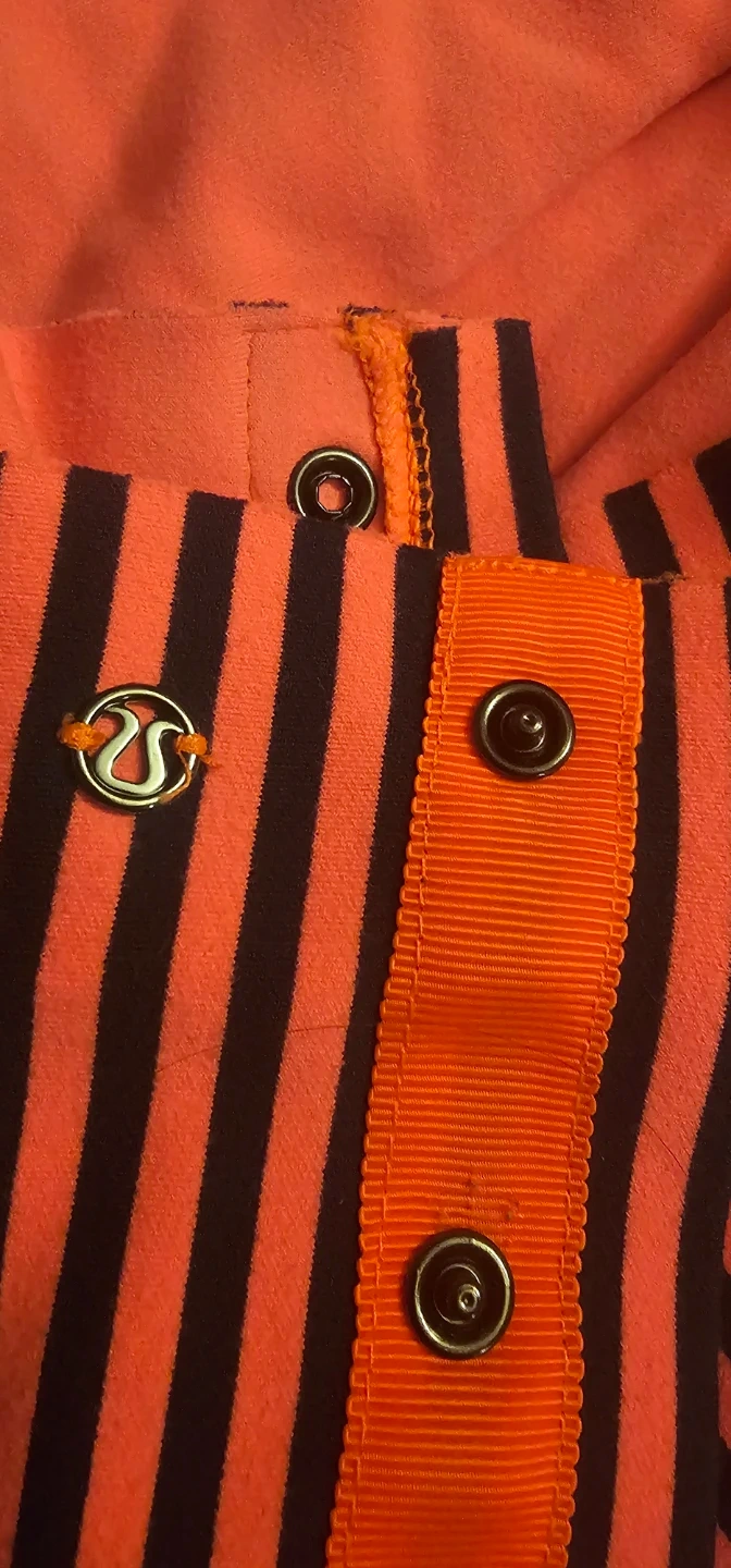 587This Lululemon item features orange and black stripes, and it is available in one size (O/S). It offers versatile styling options