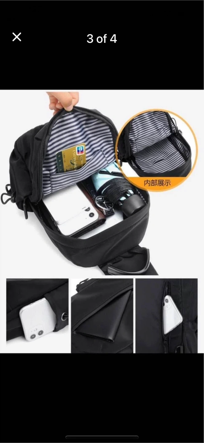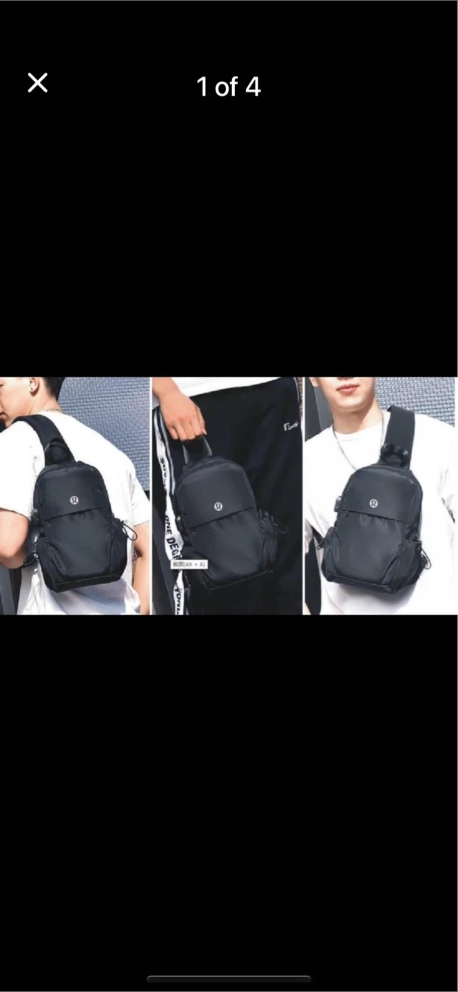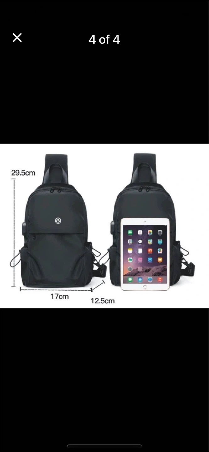 This Lululemon sling style back pack is perfect for carrying your essentials! The sleek black design is versatile and stylish. It measures 29.5cm x 17cm x 12.5cm, making it compact yet spacious enough for your phone, wallet, and keys