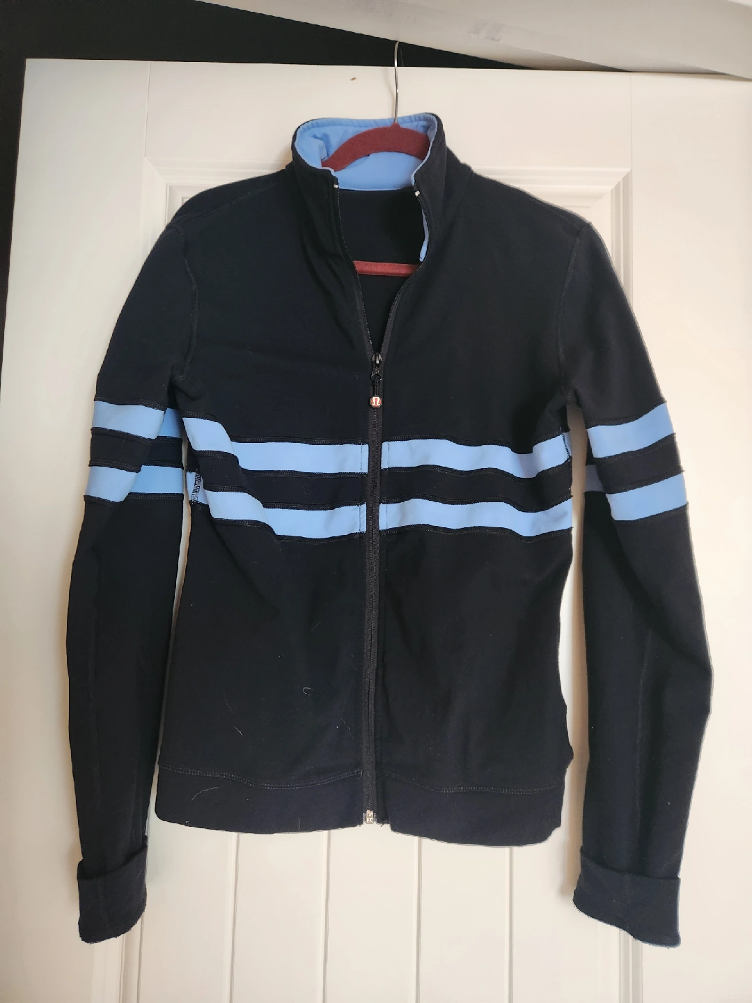 15This is a Lululemon jacket in black with light blue stripes. It's in great condition and perfect for layering!