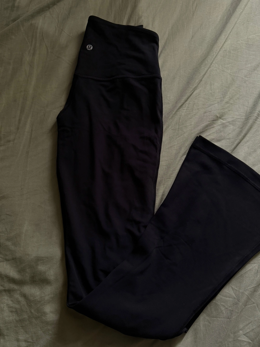 Black flare pants. High-waisted. Excellent for yoga or casual wear.