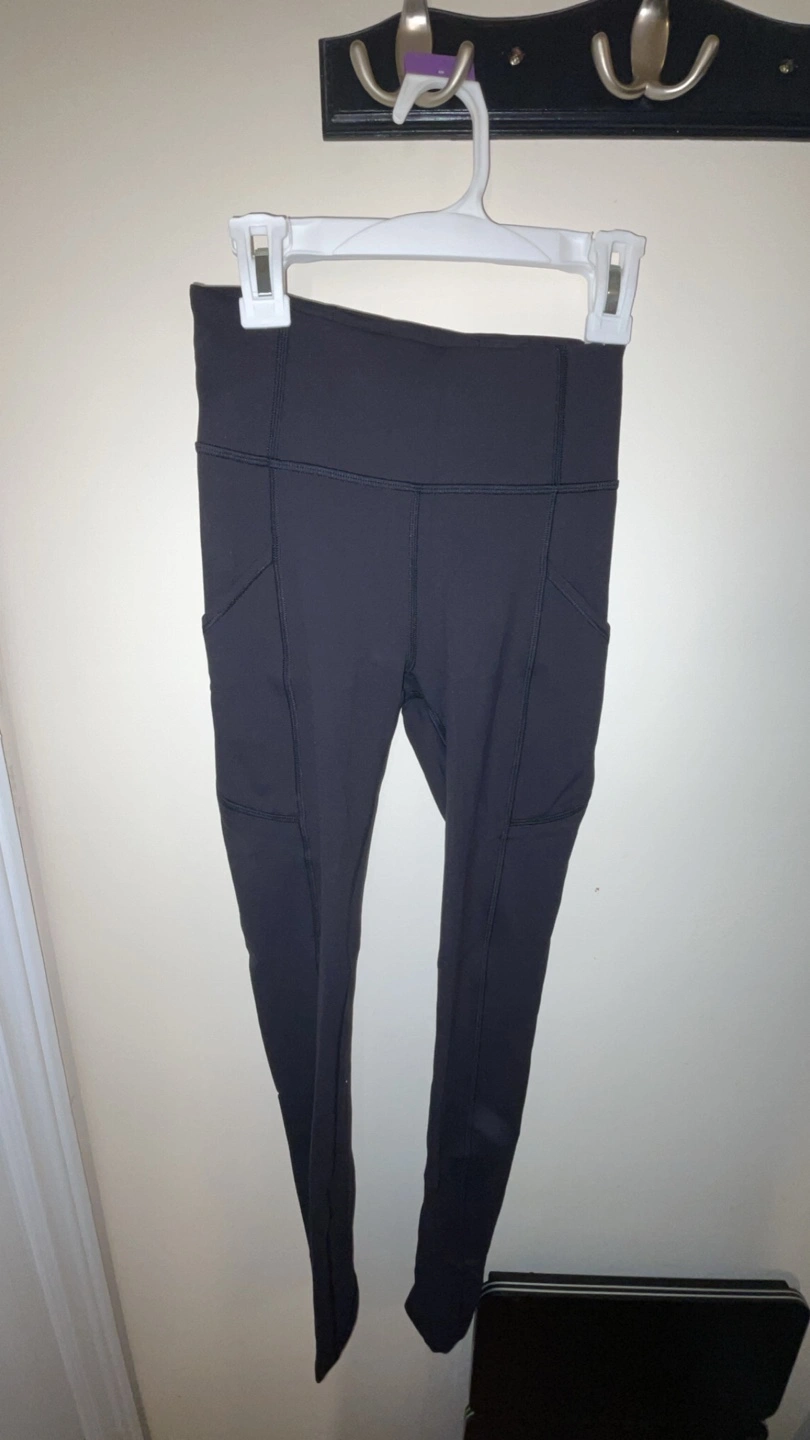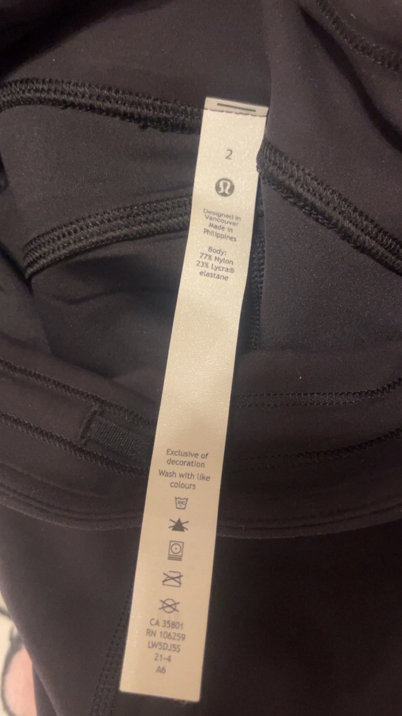 Lululemon black leggings. Size 2. 77% nylon, 23% elastane. Side pockets. Excellent for everyday wear. expensive brand