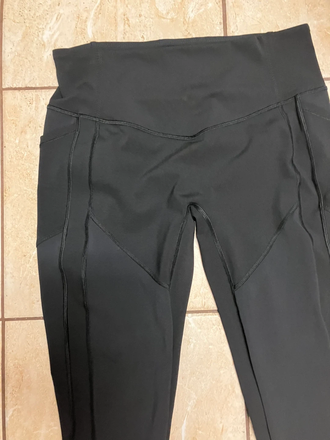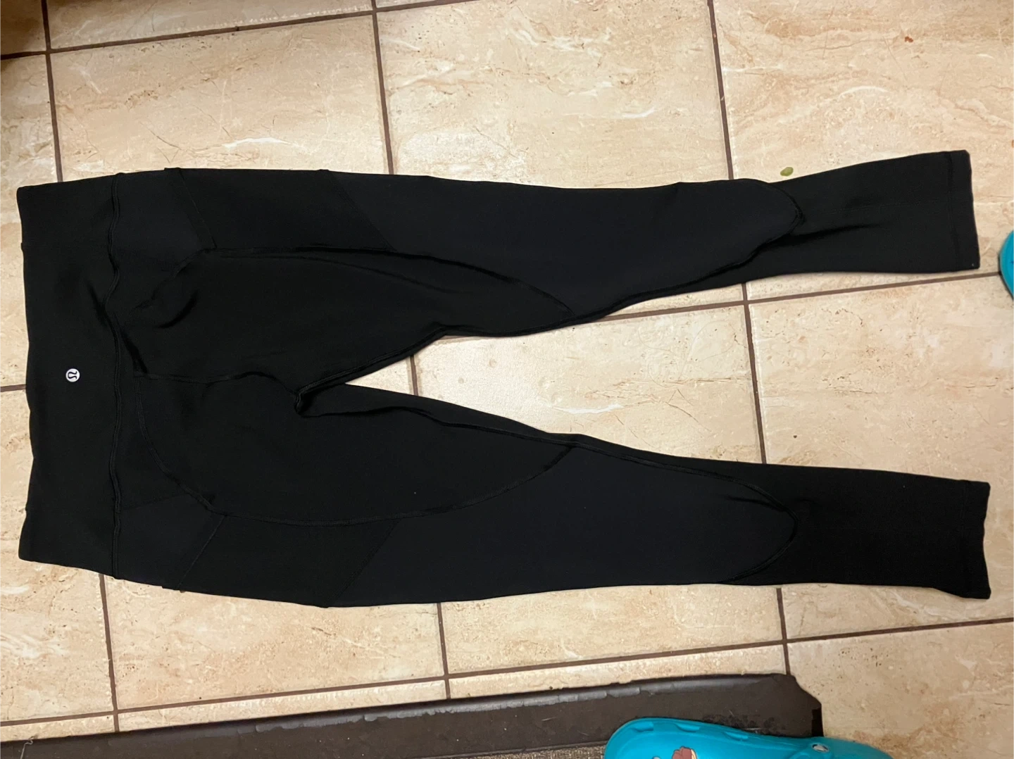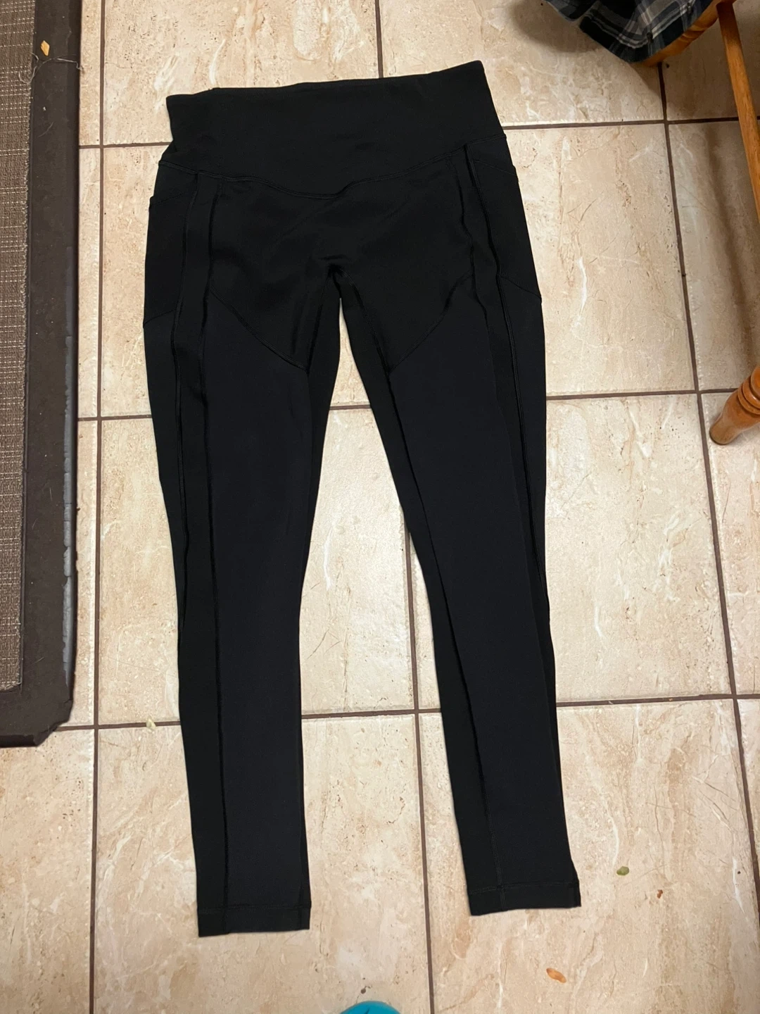 Selling a pair of Lululemon leggings in black! They have convenient pockets on the sides, perfect for holding your phone or keys while you're out and about. These leggings are in great condition and ready for a new home