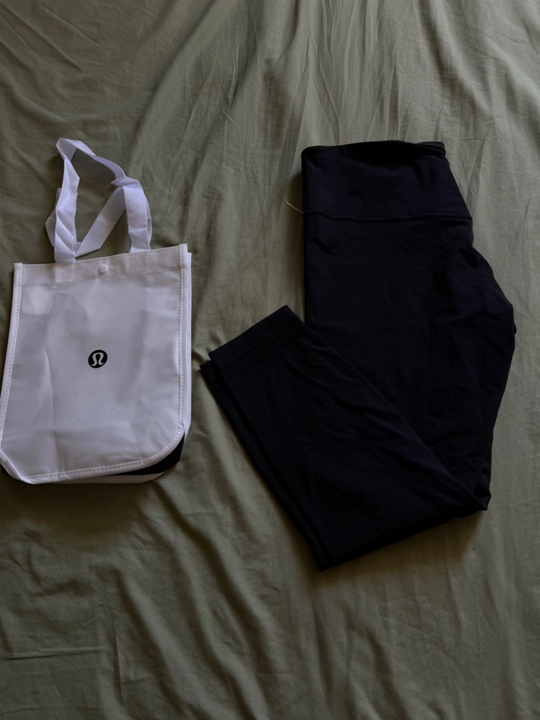 Lululemon black cropped leggings. High-waisted, and perfect for yoga or workouts. Includes a Lululemon shopping bag.