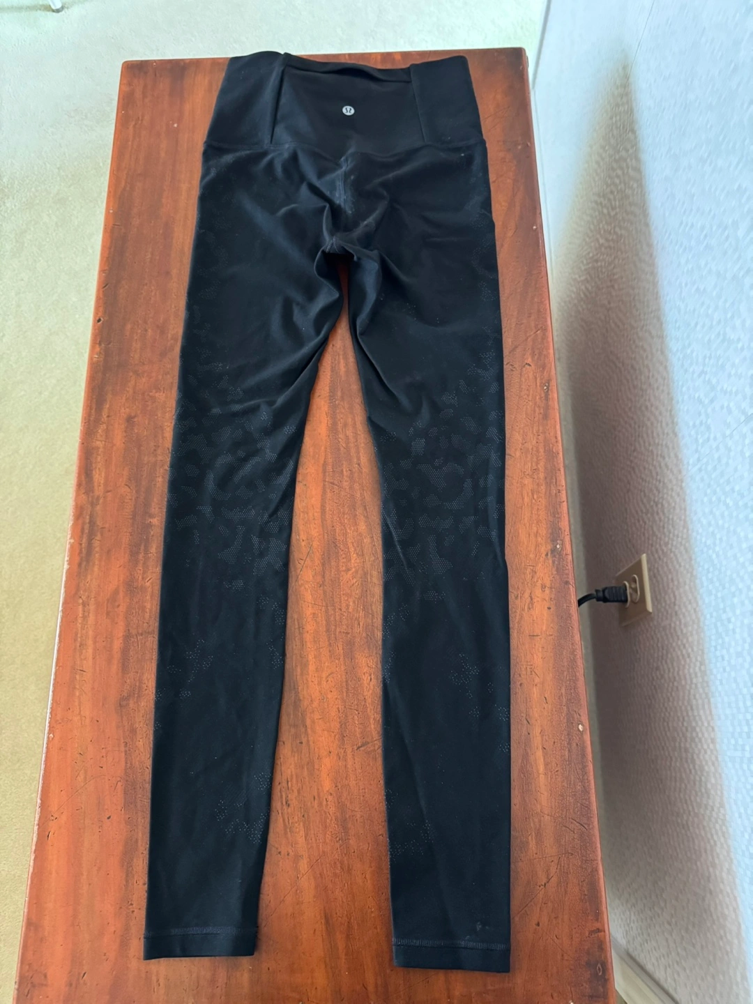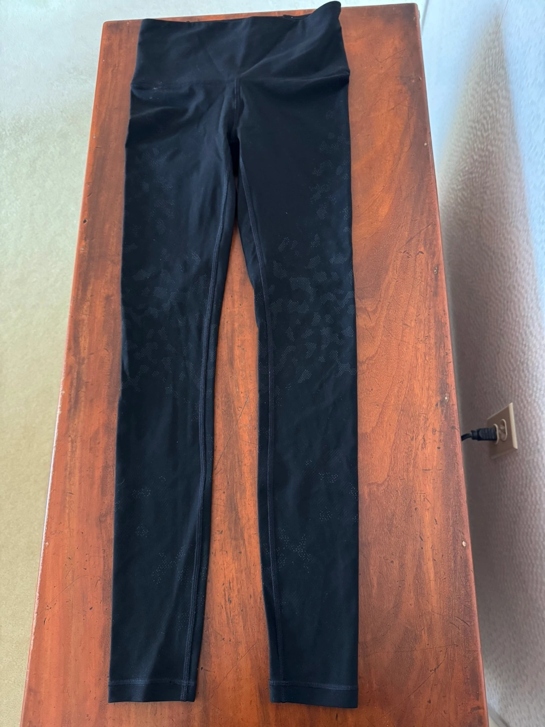 Black leggings, high-waisted, subtle leopard print pattern. Excellent for yoga or everyday wear.