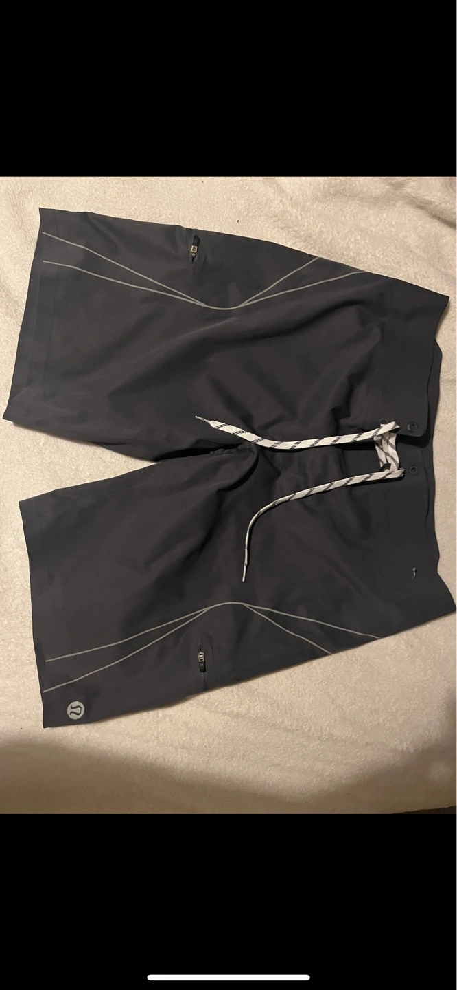 18Lululemon running shorts. Dark grey. Drawstring waist. Side pockets. Reflective detailing.