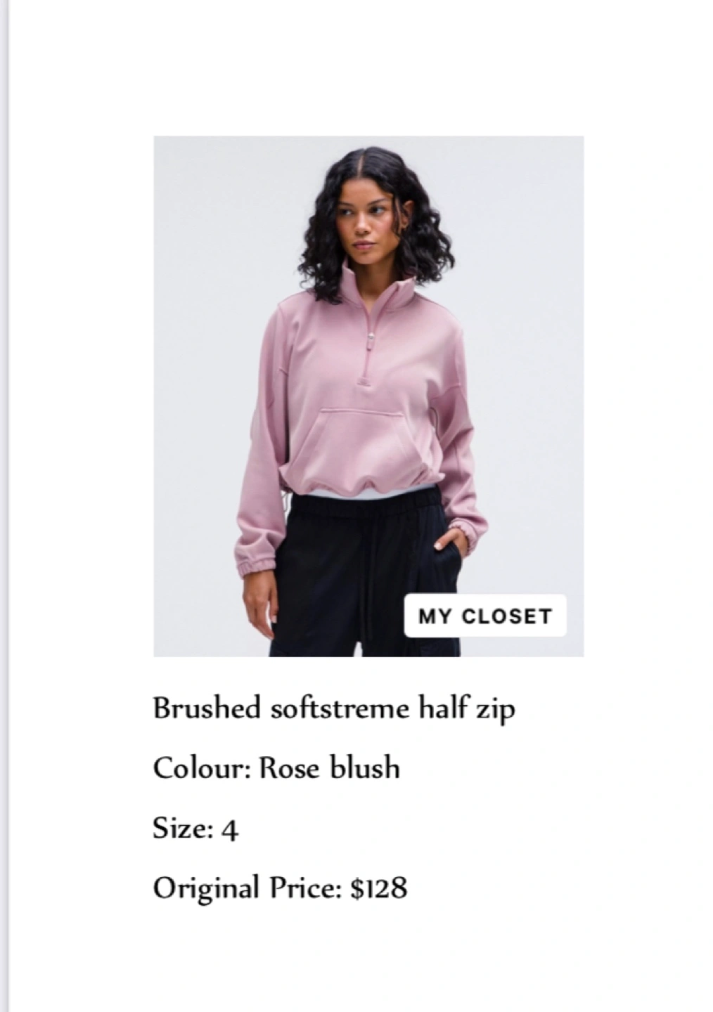 Lululemon, Rose blush colour. Half zip pullover. Soft material. Size 4.