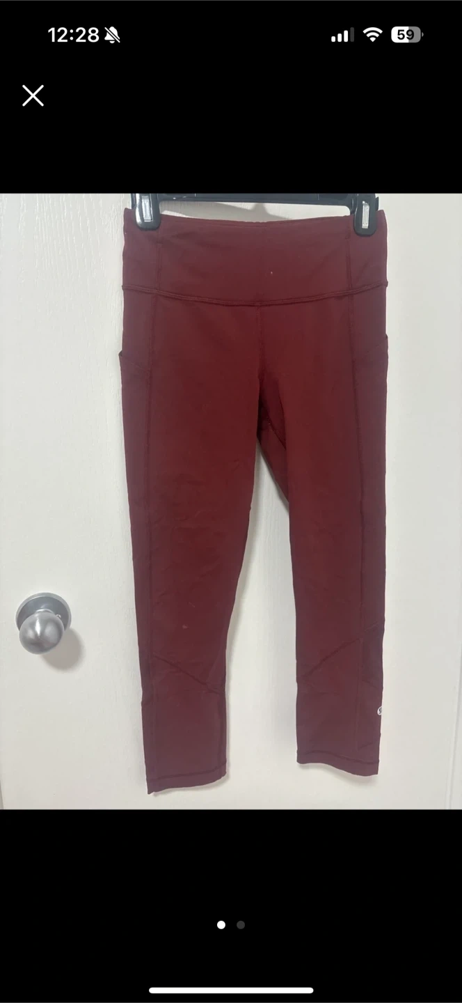 Selling a pair of Lululemon leggings in a lovely burgundy colour! They're in great condition and ready for a new home. Perfect for workouts or just lounging around size 4 pick up cash only