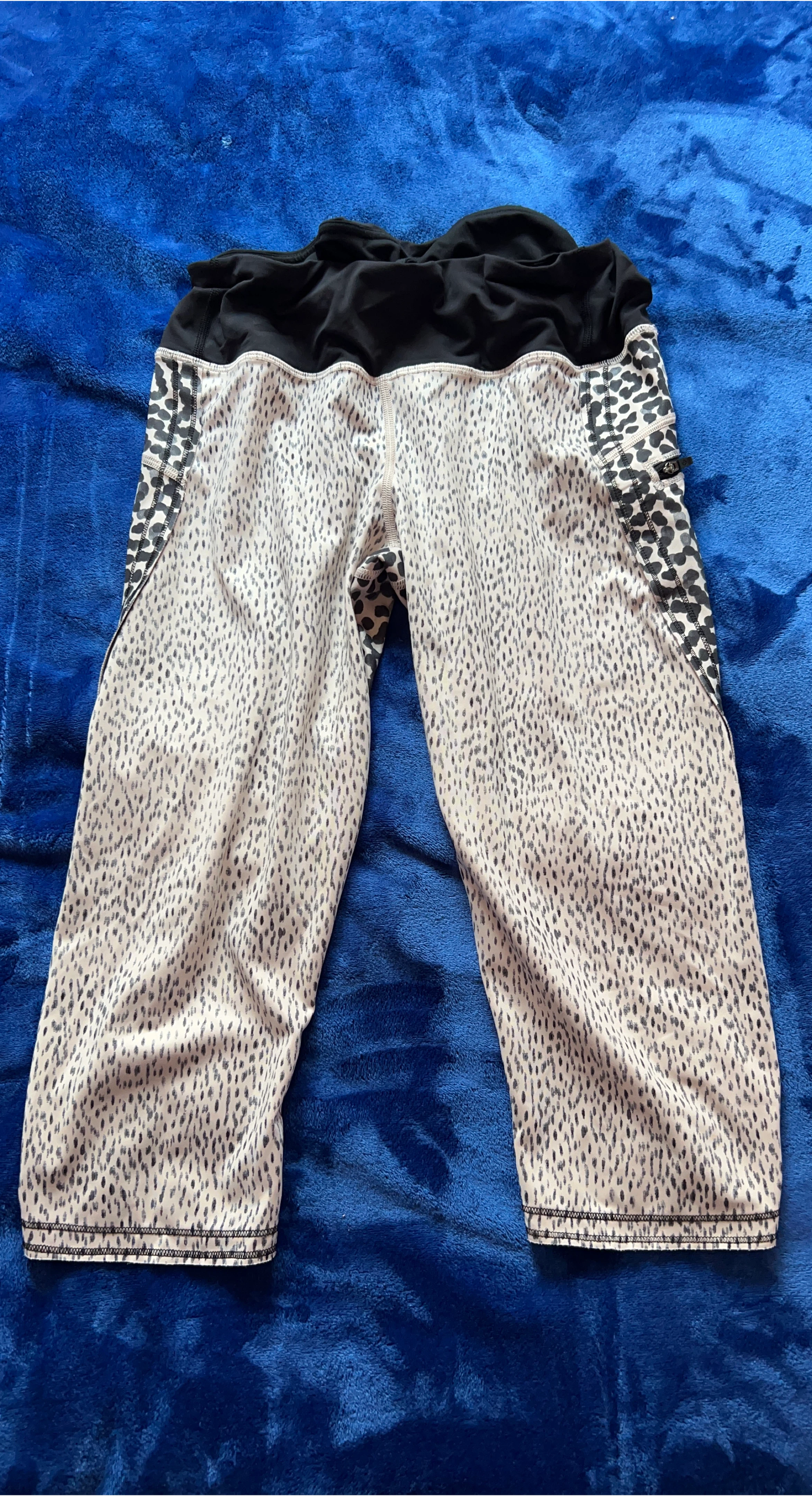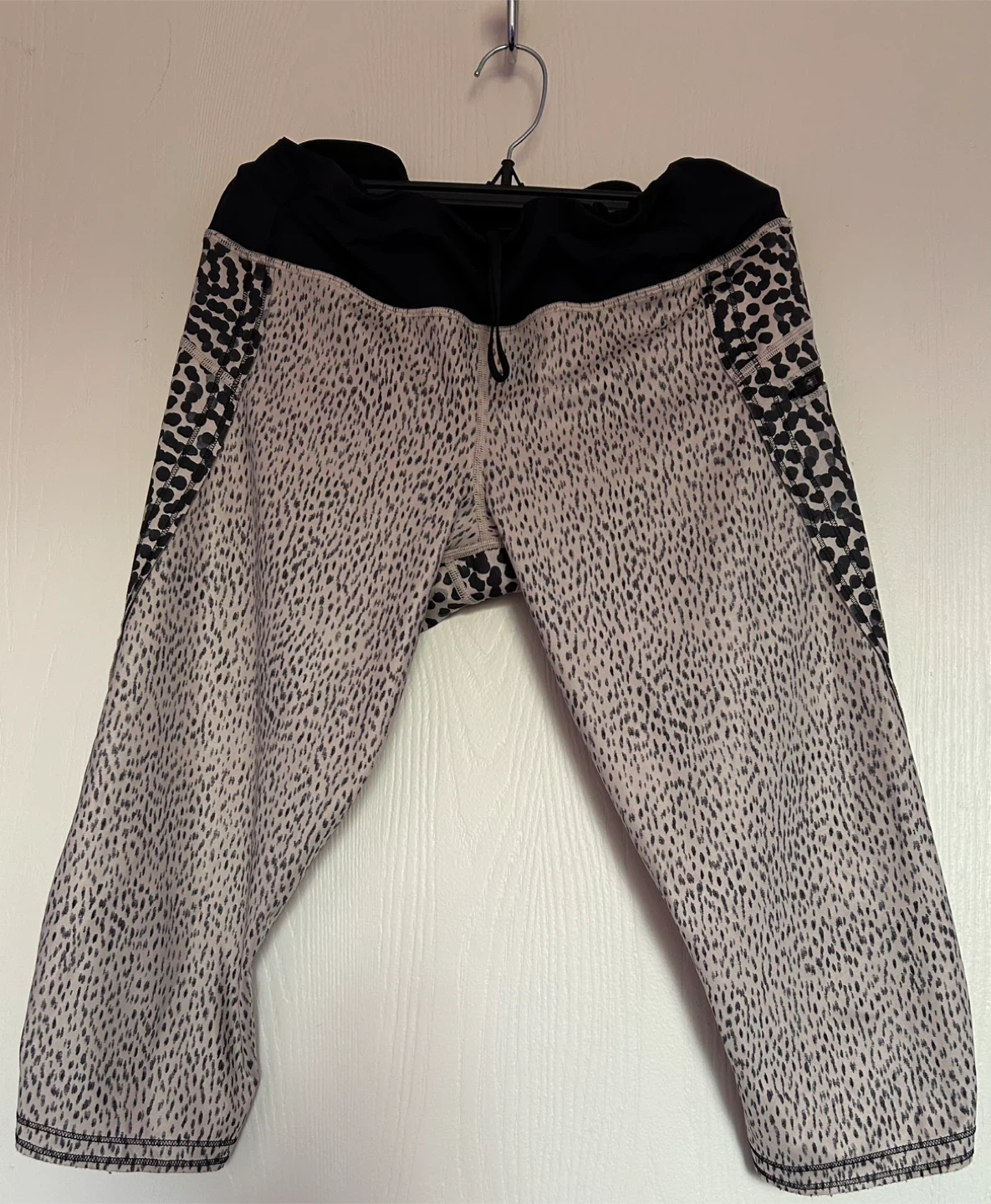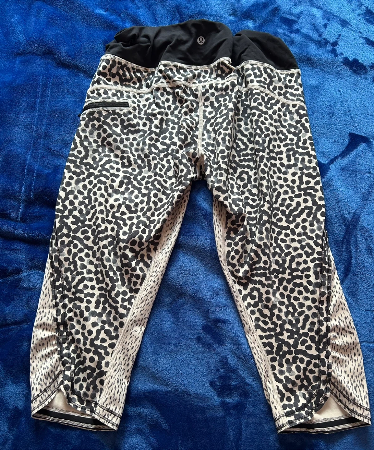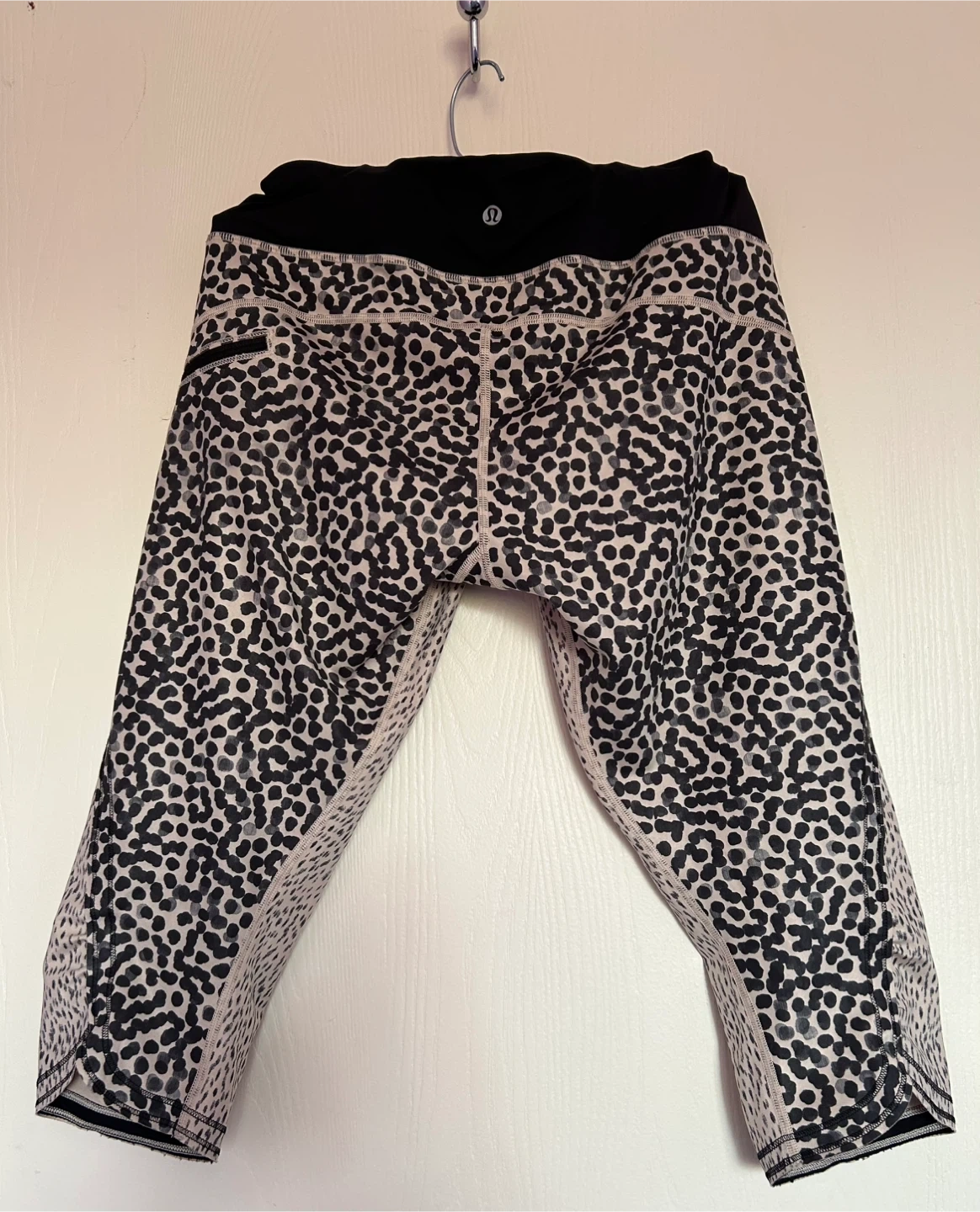 Selling a pair of Lululemon capri leggings in great condition! They feature a black waistband and a unique spotted pattern. Perfect for workouts or everyday wear!