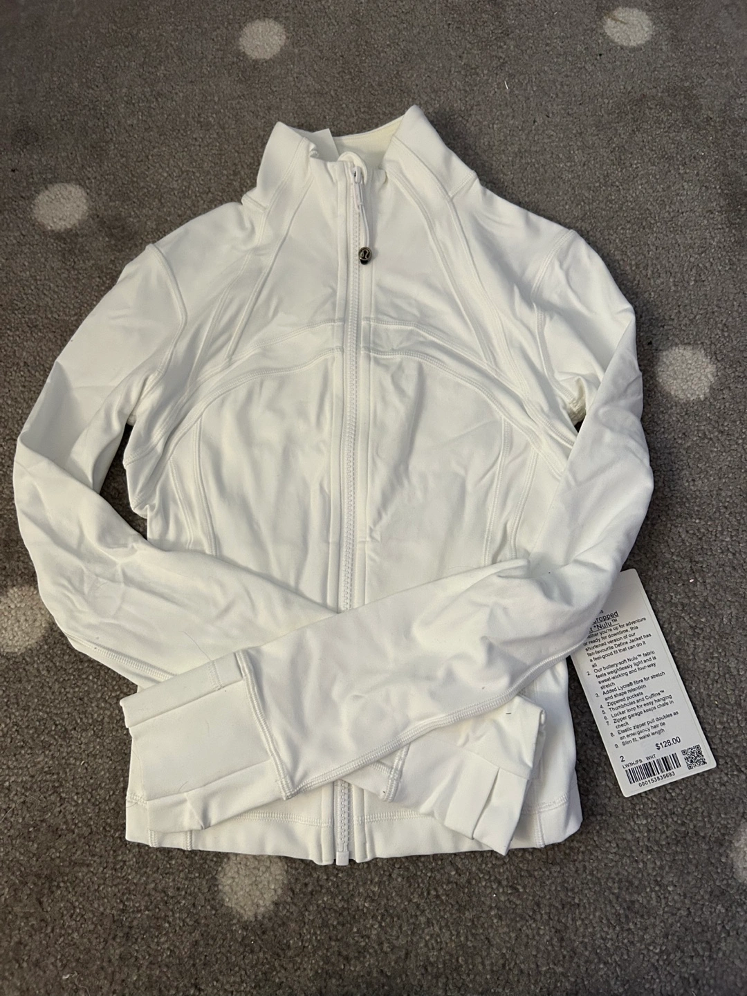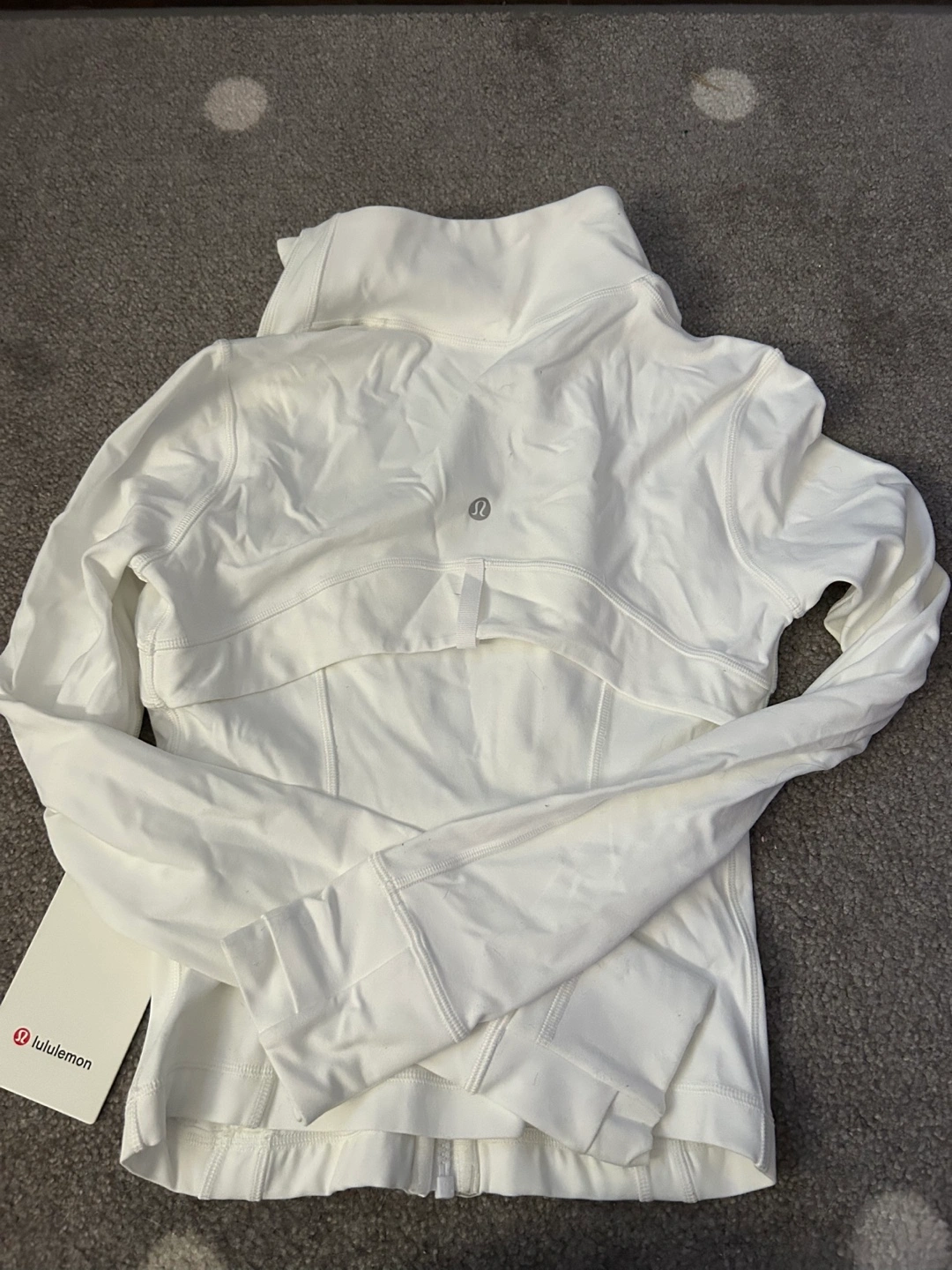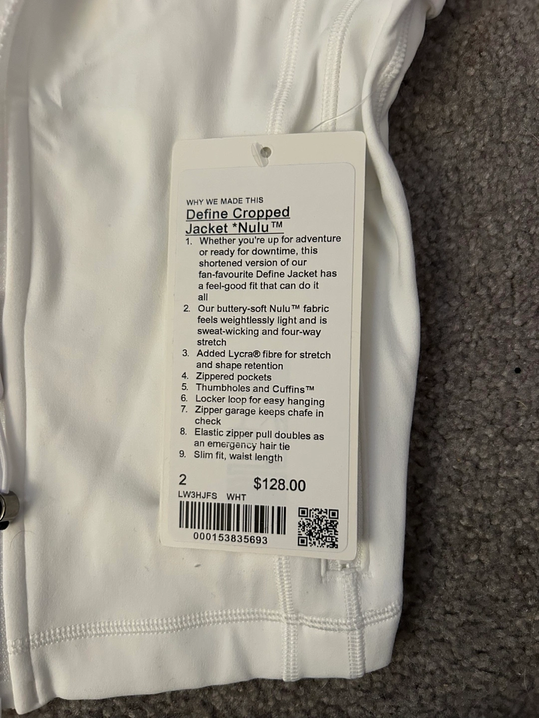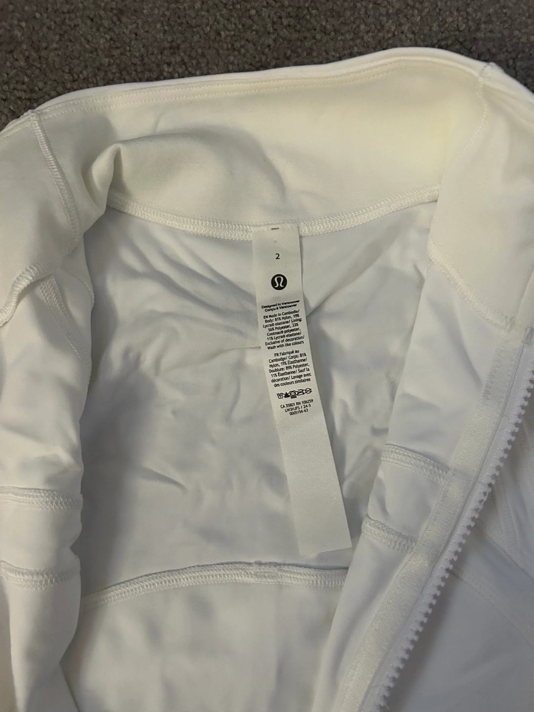 White cropped jacket. Size 2. Long sleeves with thumbholes. Zip up with a high neck.