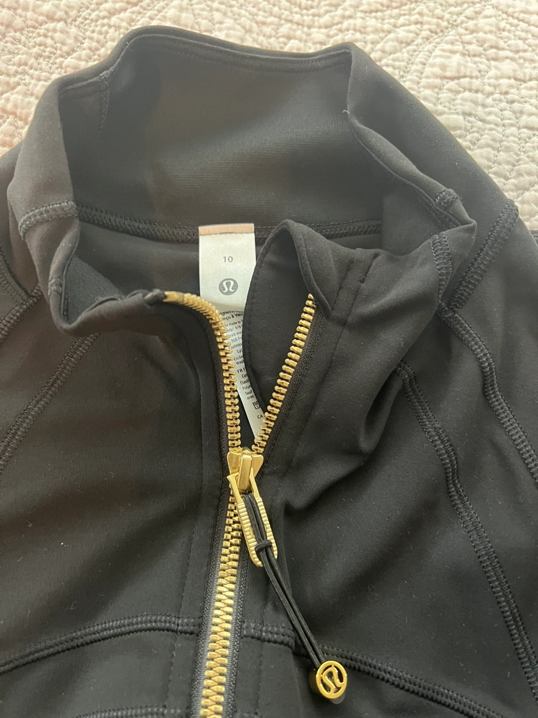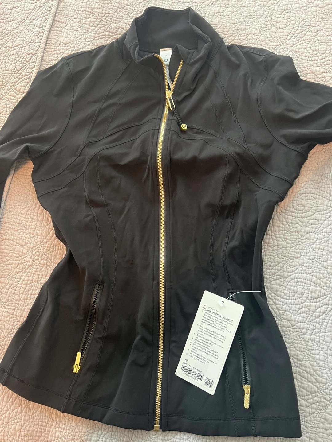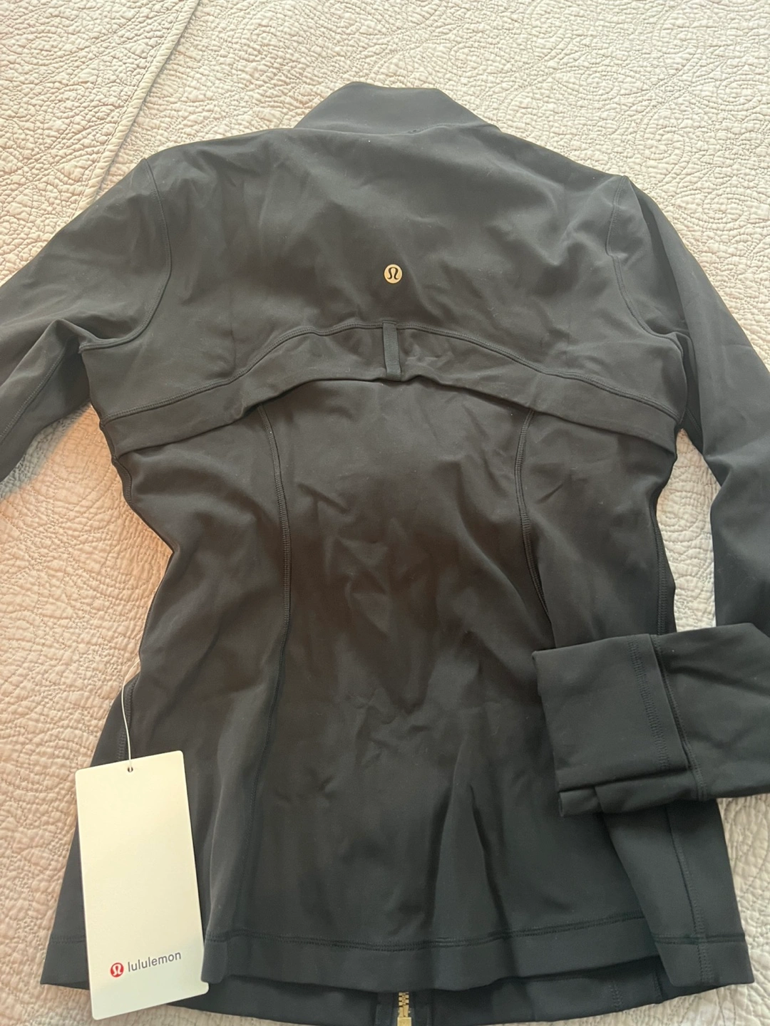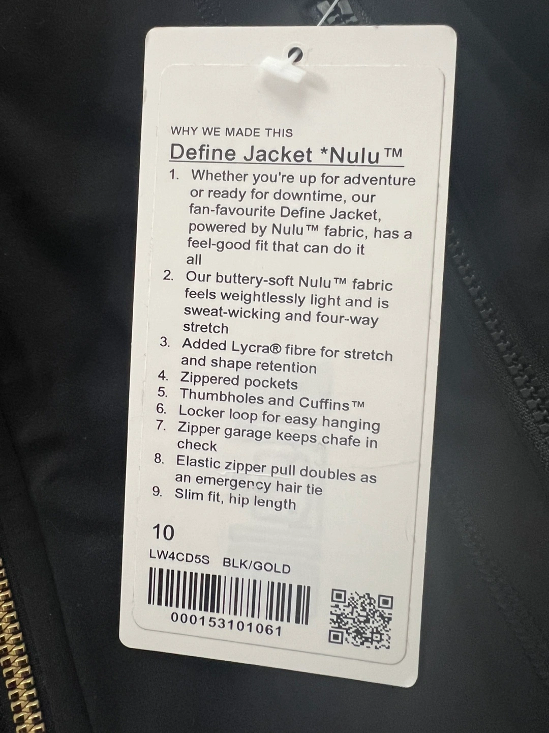 Selling a brand new, never worn, Lululemon Define Jacket in size 10! It's made with buttery-soft Nulu™ fabric, feeling weightlessly light with sweat-wicking and four-way stretch. It also has added Lycra® fibre for stretch and shape retention. The jacket features zippered pockets, thumbholes and Cuffin™s, a locker loop, and a zipper garage to keep chafe in check. There's even an elastic zipper pull that doubles as an emergency hair tie! Slim fit, hip length.
