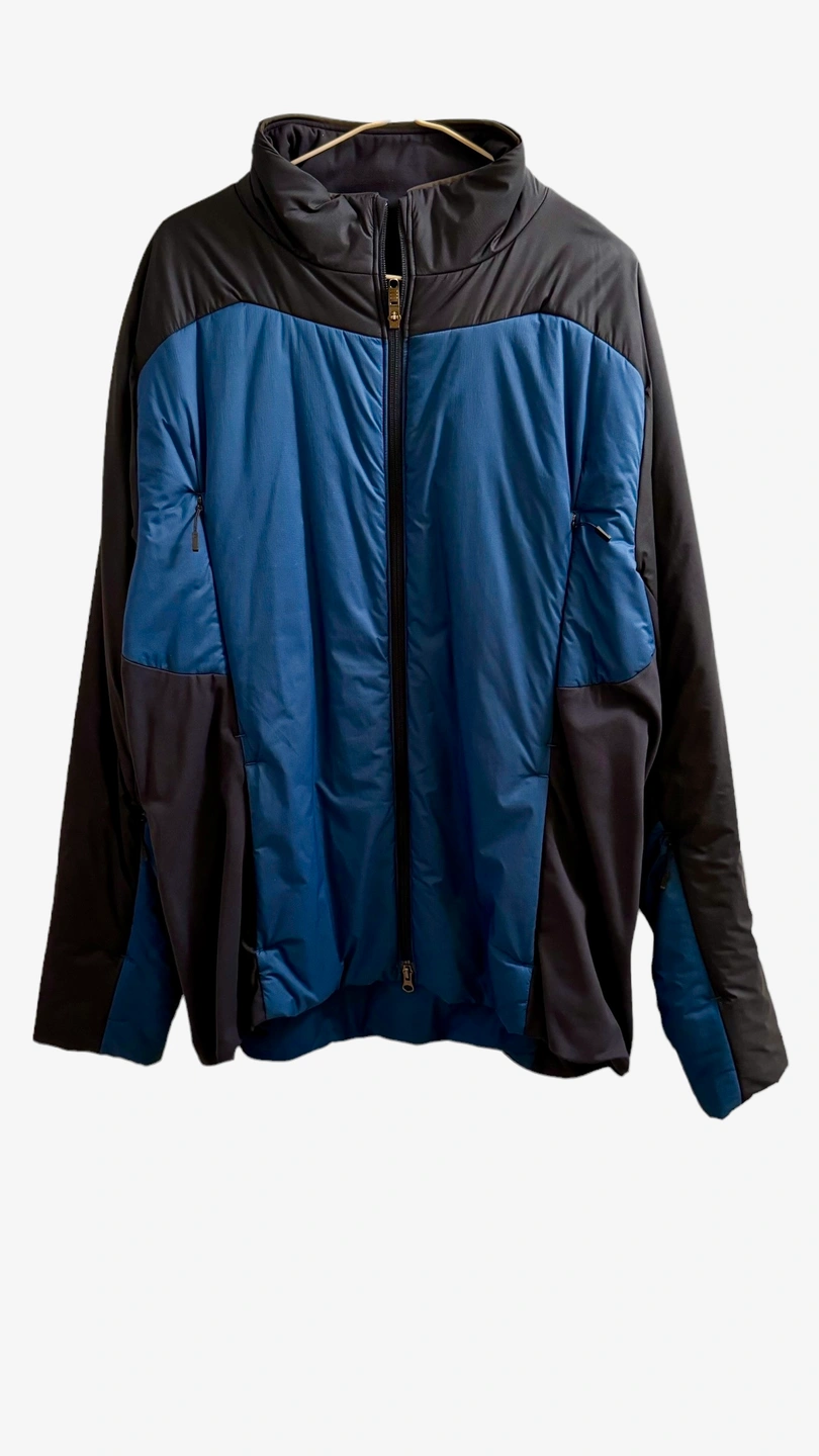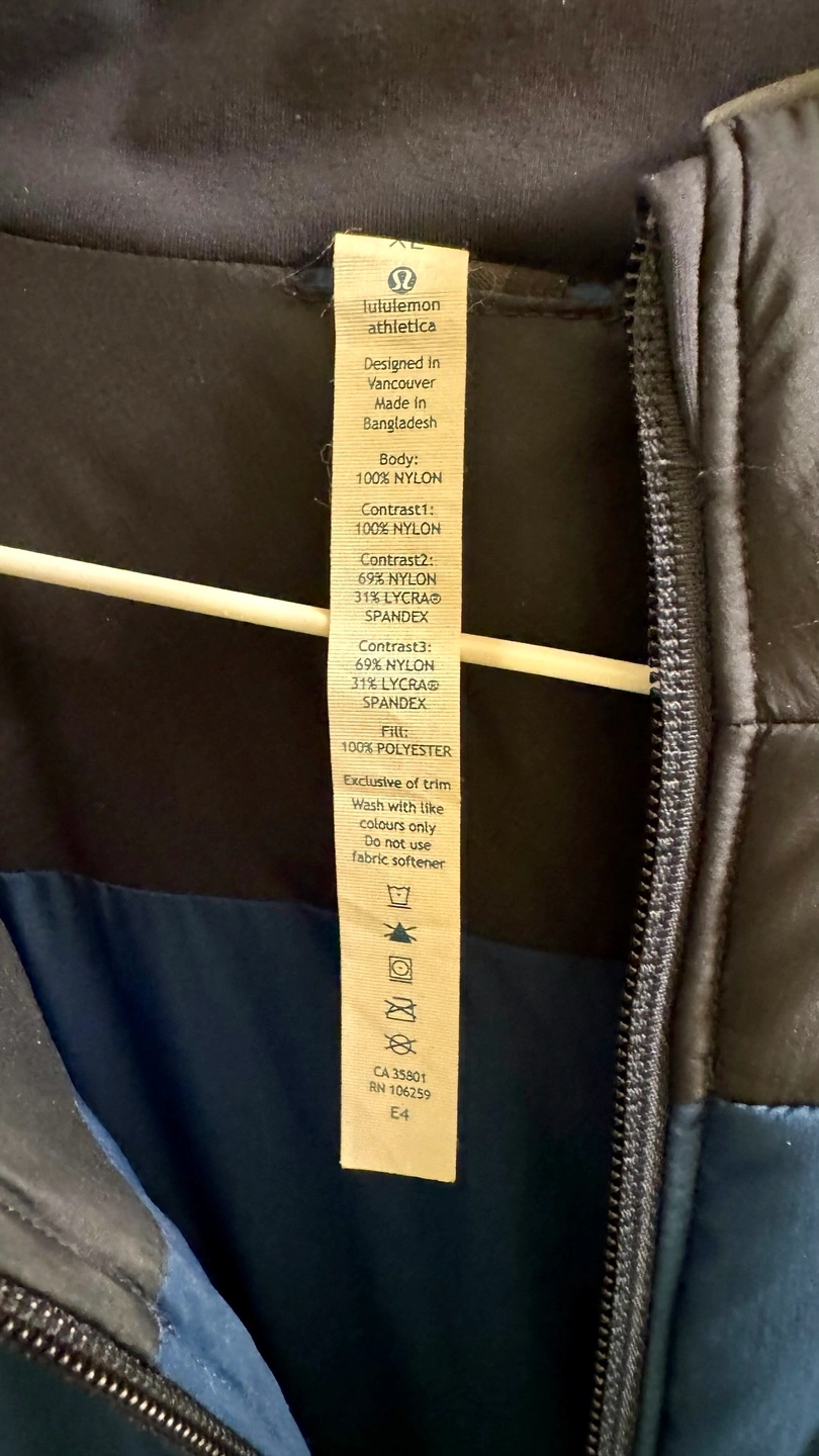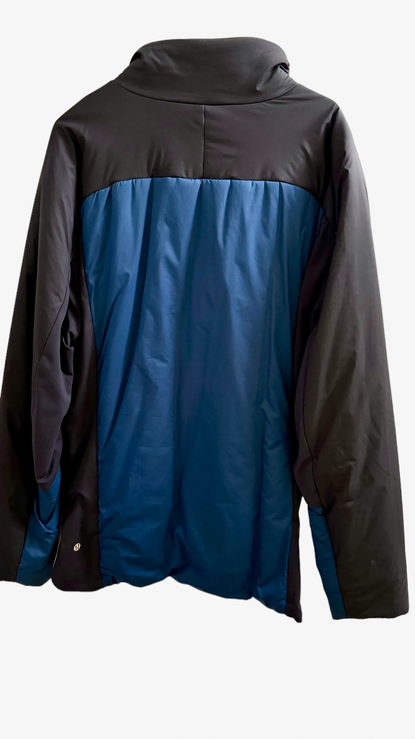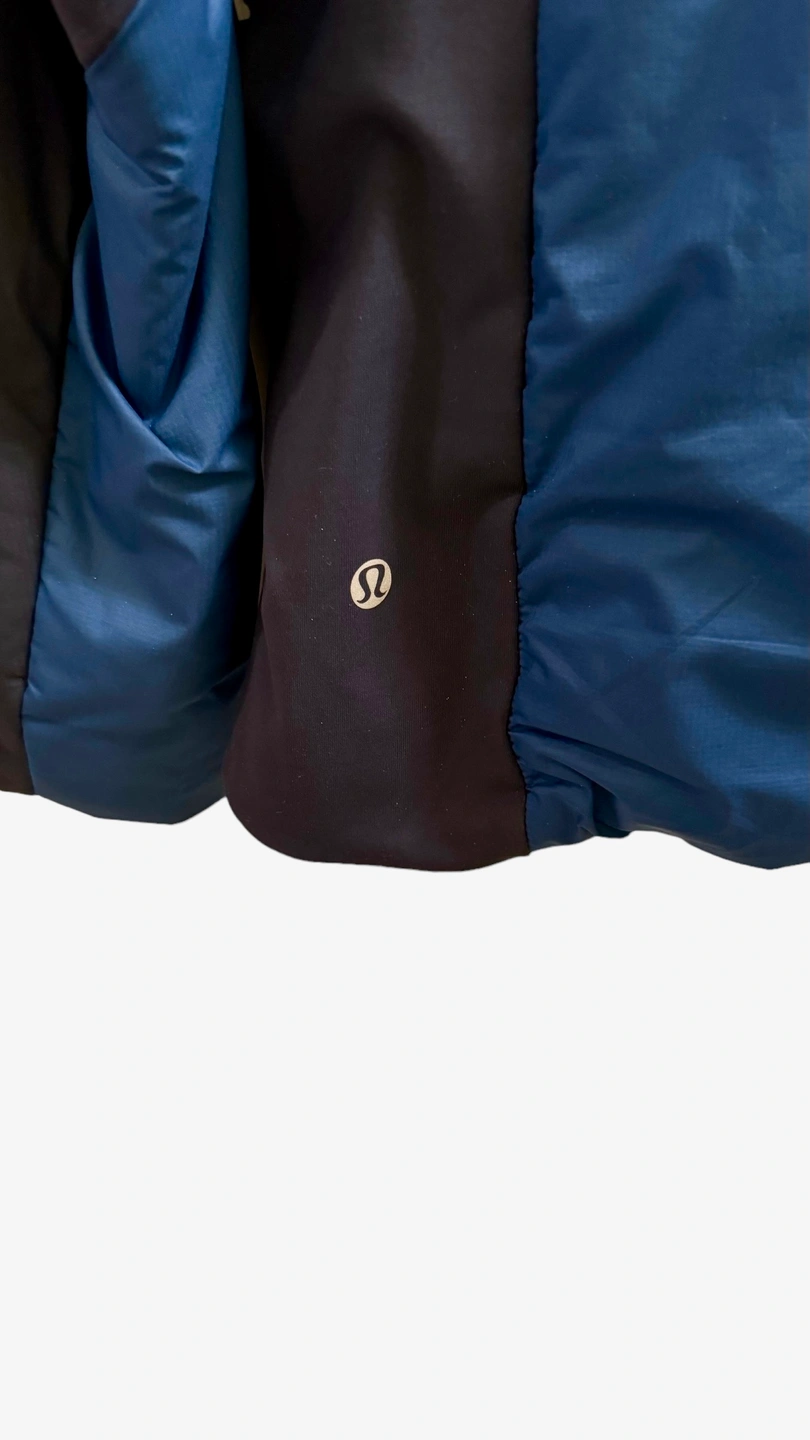 Lululemon down jacket. Blue and black colour. It is a lightweight jacket with a full zip closure. It has a stand up collar and two pockets on the front.