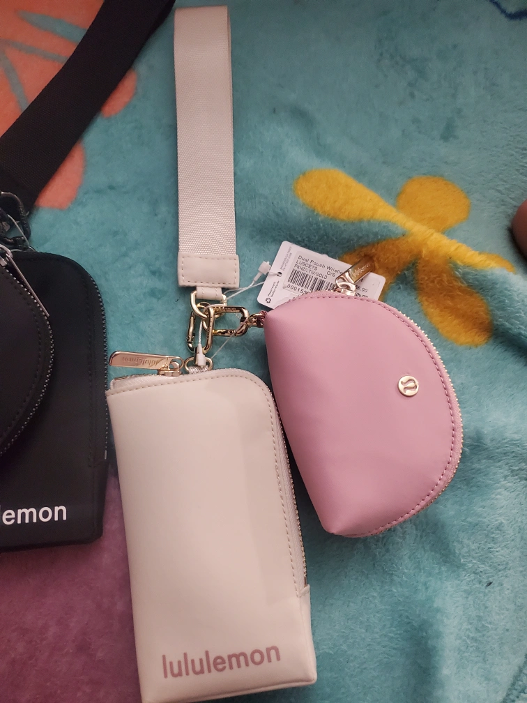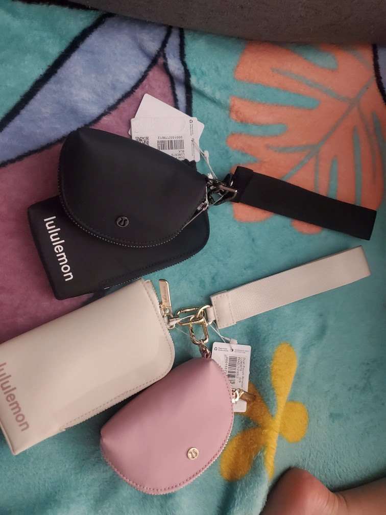 Three Lululemon bags. Two Everywhere Belt Bags, one black and one off-white. One small pink pouch. All with detachable straps. Perfect for carrying essentials.