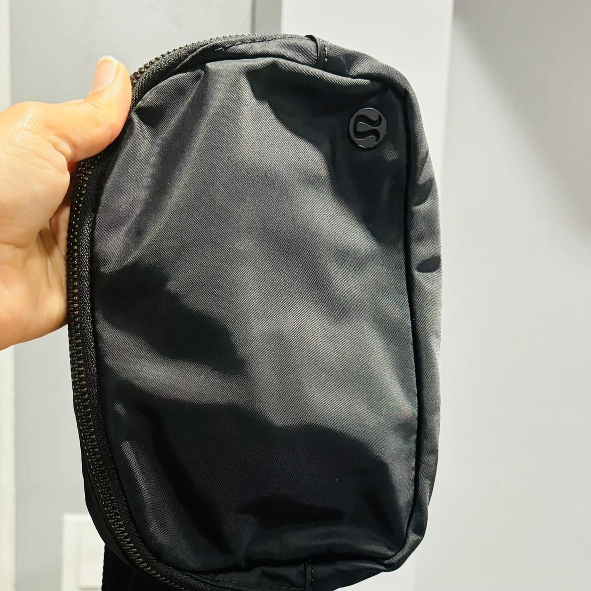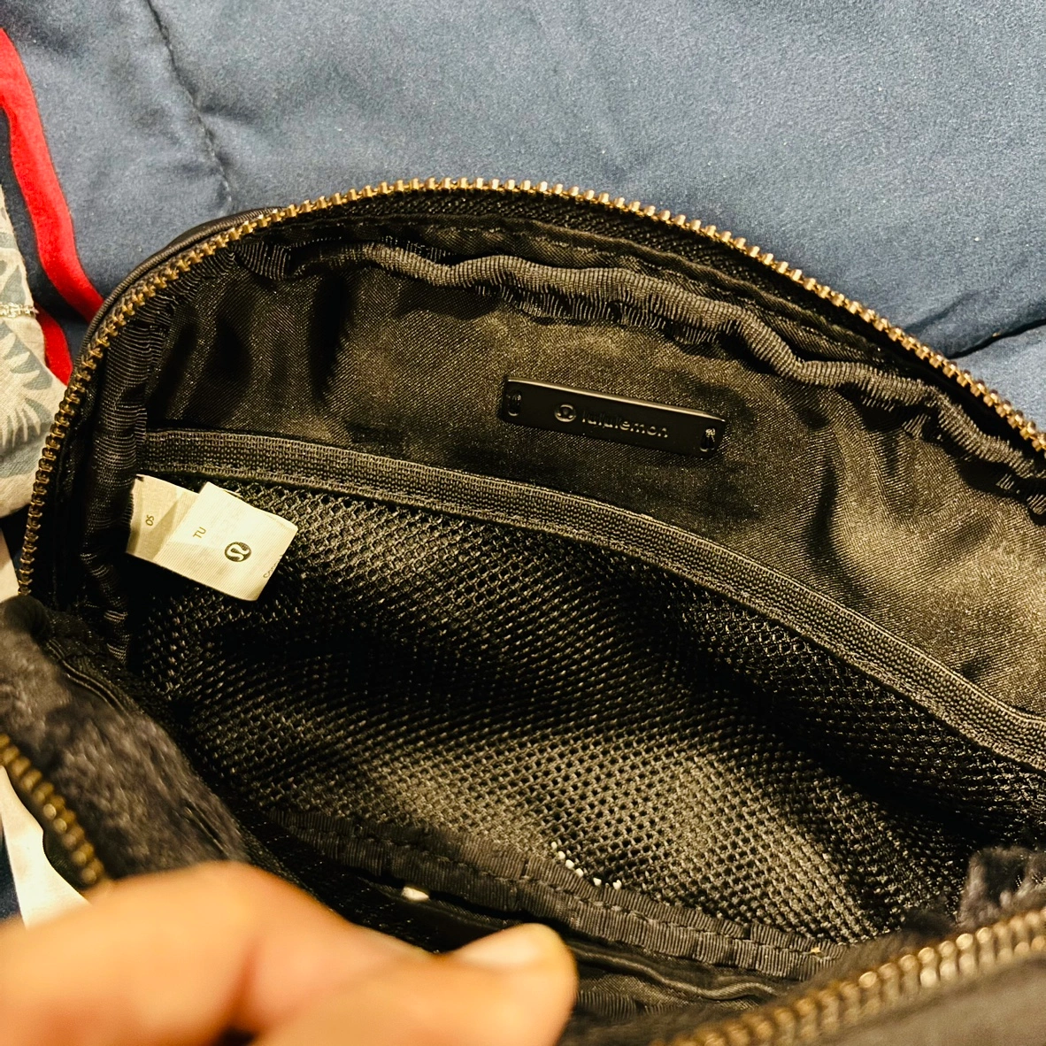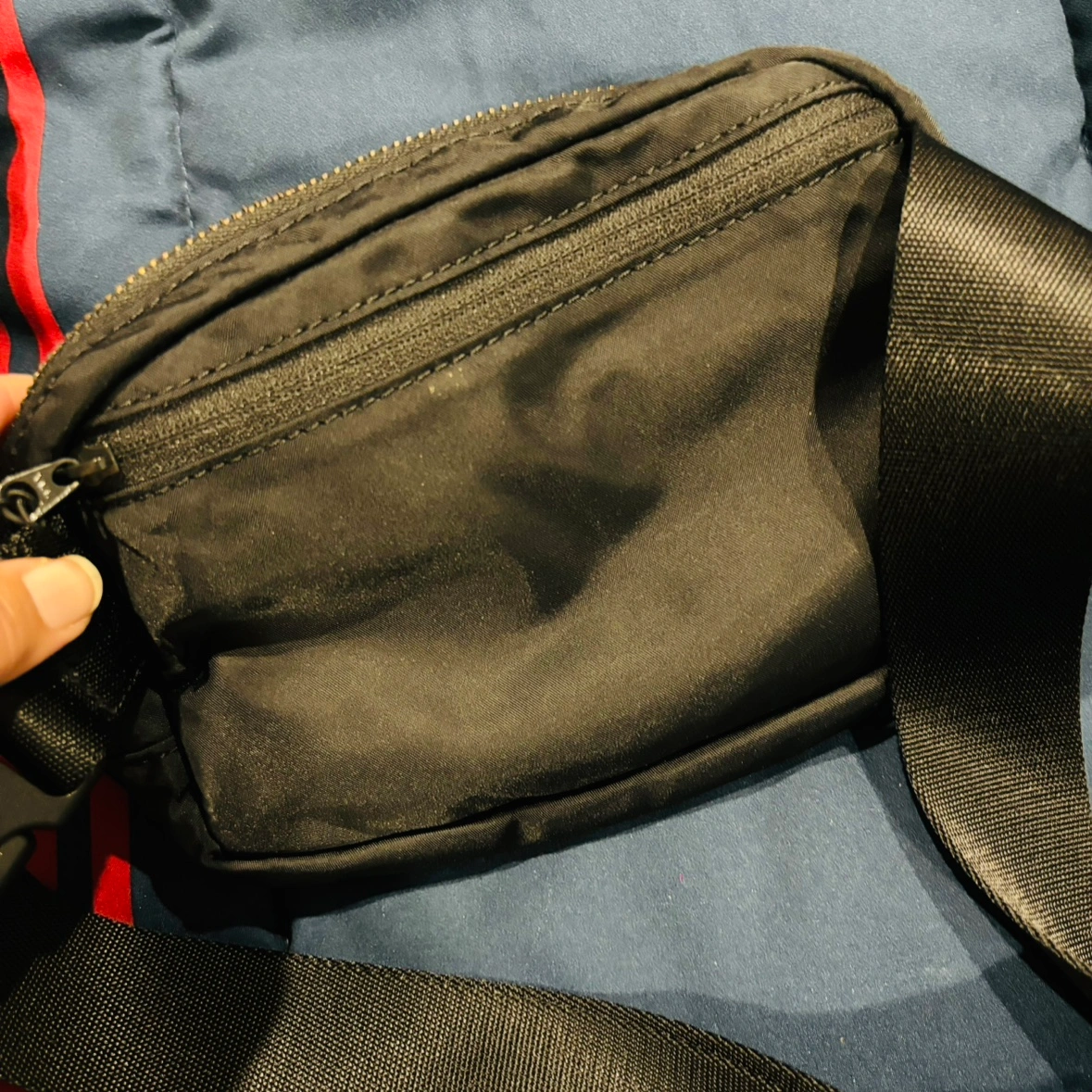 Black belt bag with adjustable strap and interior mesh pocket.Has room for all of the essentials on the go.Used twice only.The strap is adjustable and there is a compartment at the back too.It retails for $44 + tax.