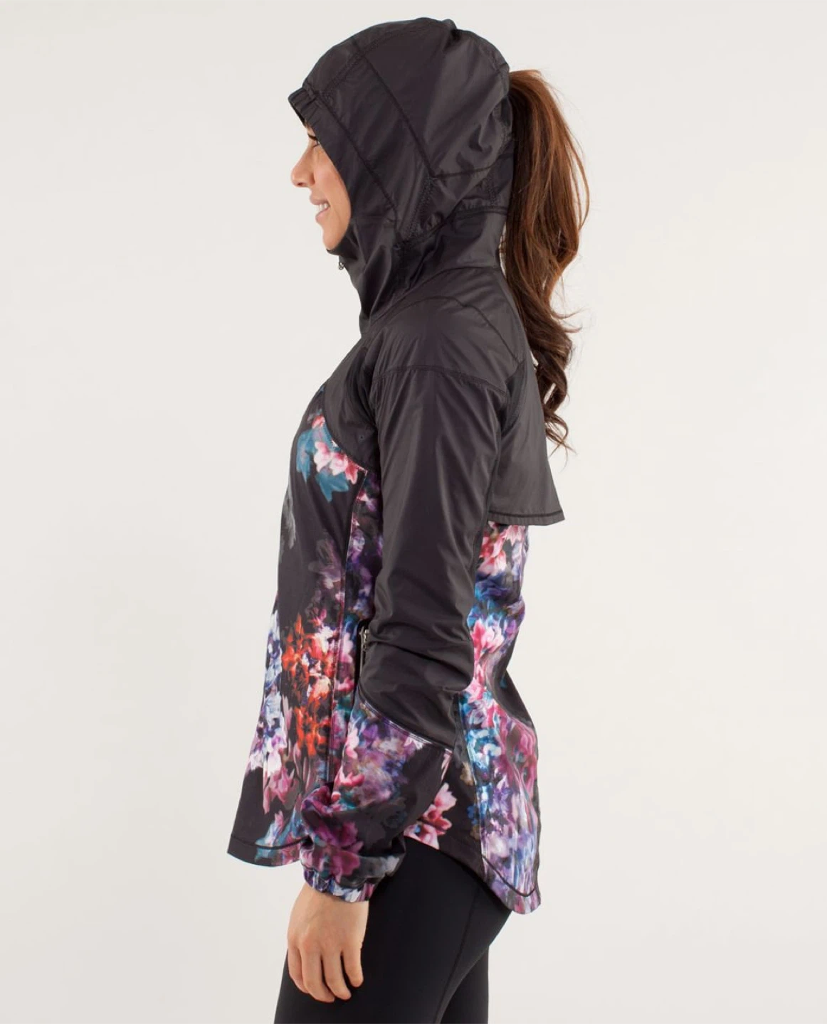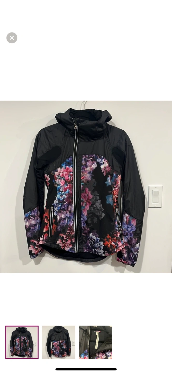 Selling a Lululemon running jacket with a unique floral print! It's black with a vibrant floral design on the lower half and sleeves. Perfect for staying stylish while you work out or go for a run!