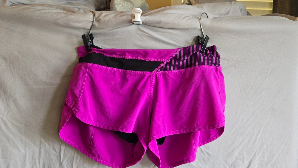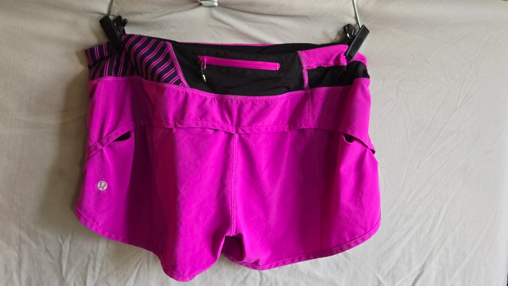 Selling a pair of Lululemon Hotty Hot shorts in size 6- 8 The shorts are a vibrant purple colour with black accents.