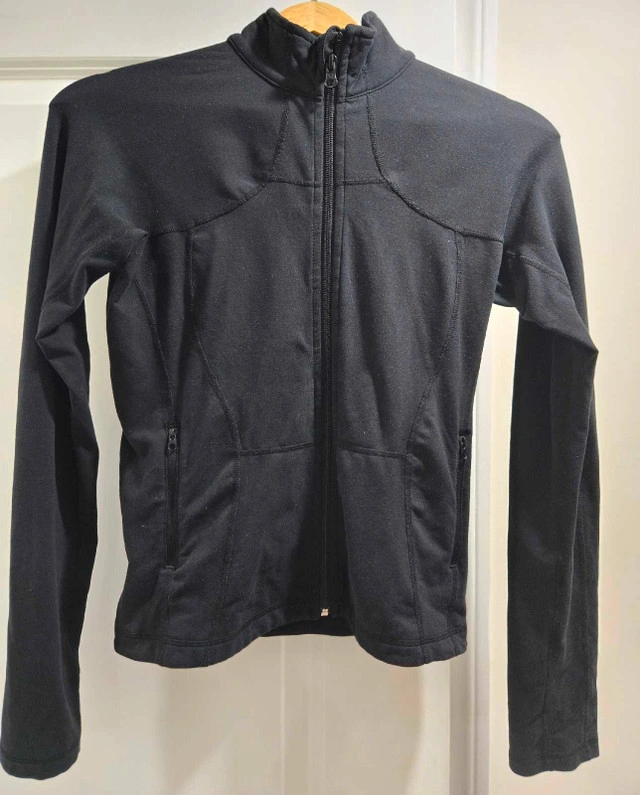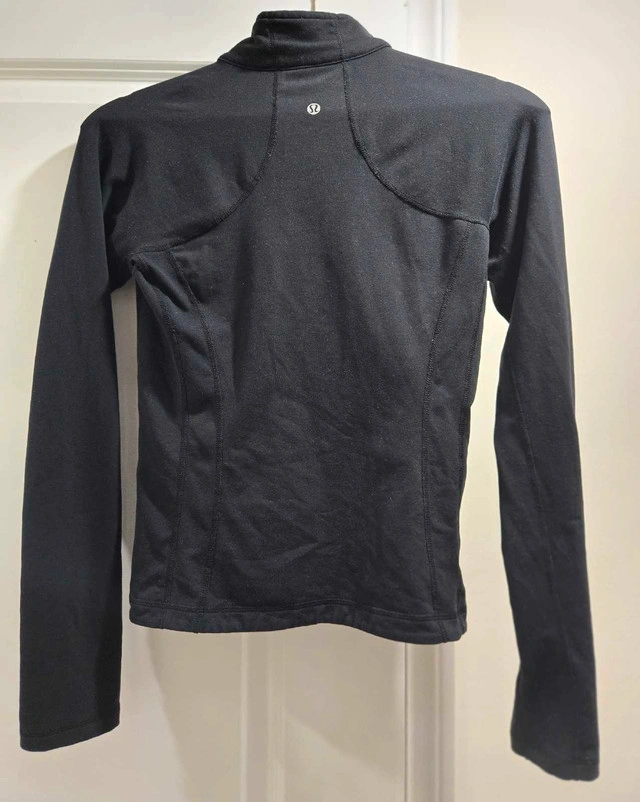 This is a used Lululemon jacket, perfect for workouts or casual wear. It's a fitted, full-zip jacket with a mock neck and long sleeves. This jacket has a flattering silhouette. * Size: XS * Colour: Black * Material: Polyester * Features: Full zip, mock neck, long sleeves, two front zippered pockets If you see this ad, it means the jacket is still available!