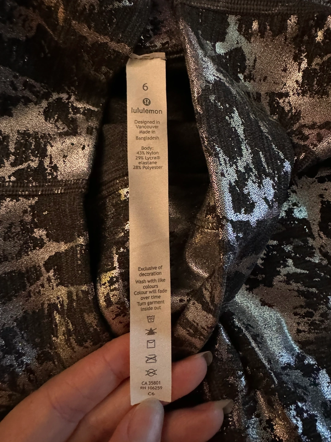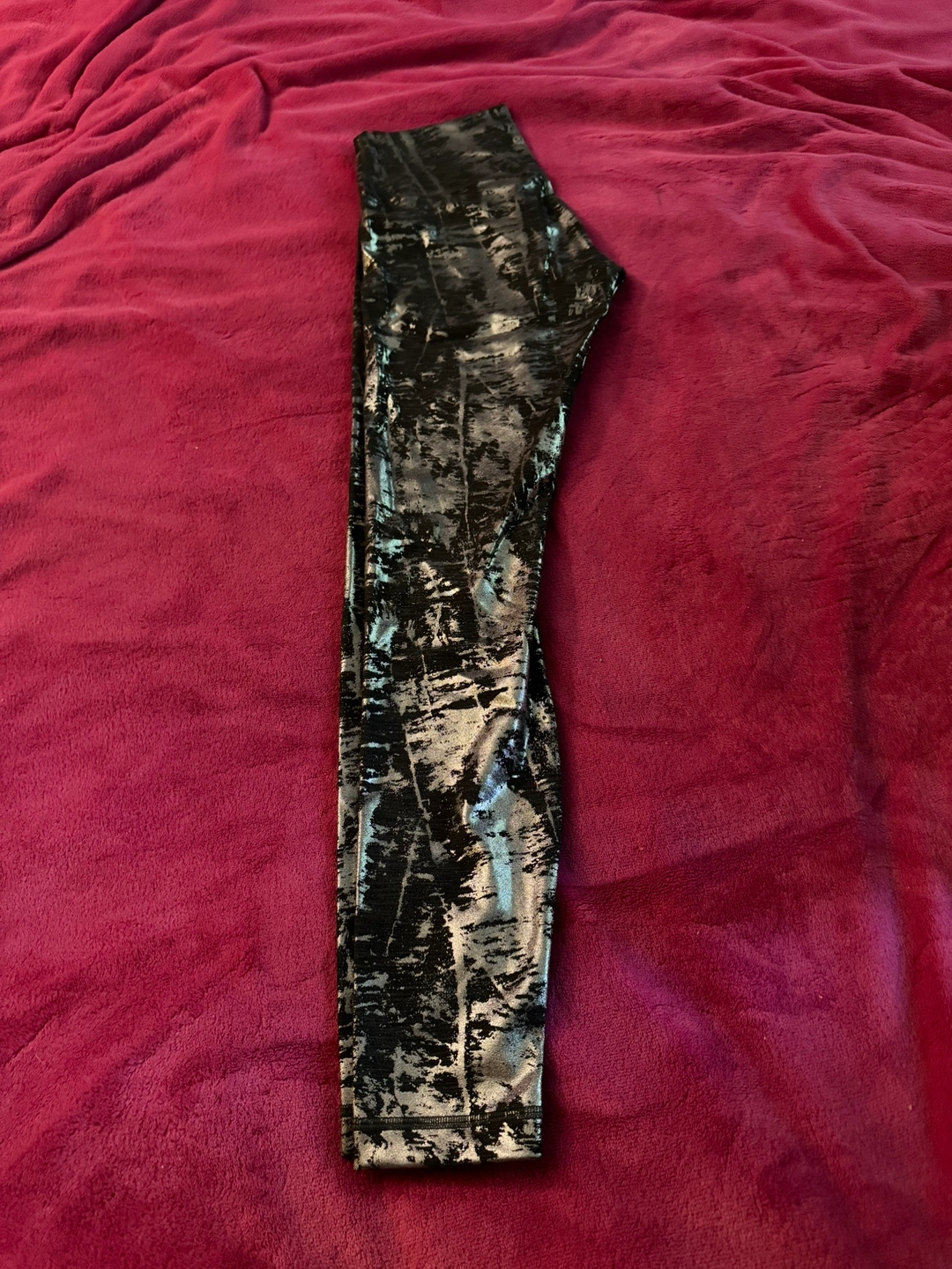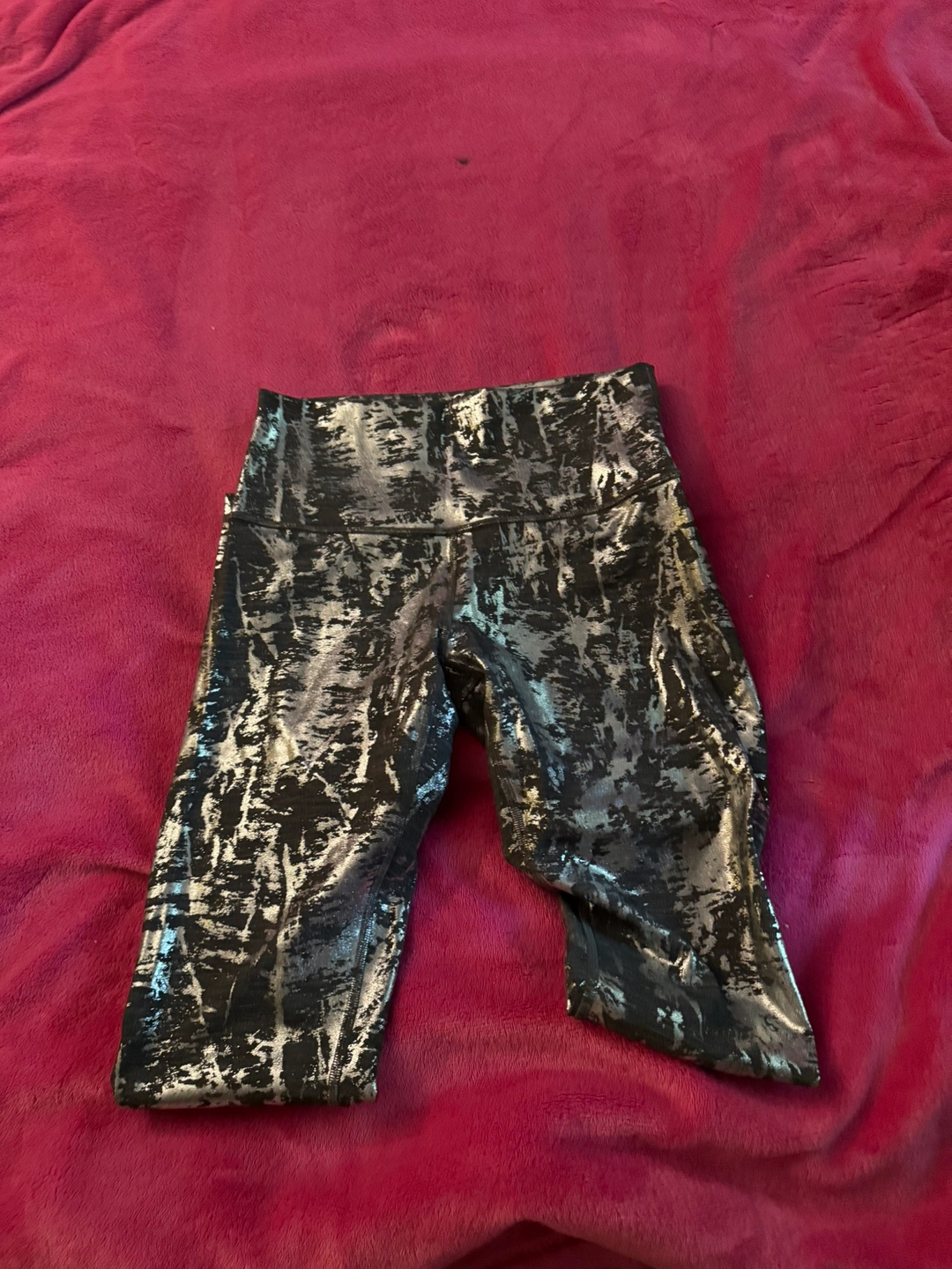 Grey and silver leggings with a high waist and a metallic finish.