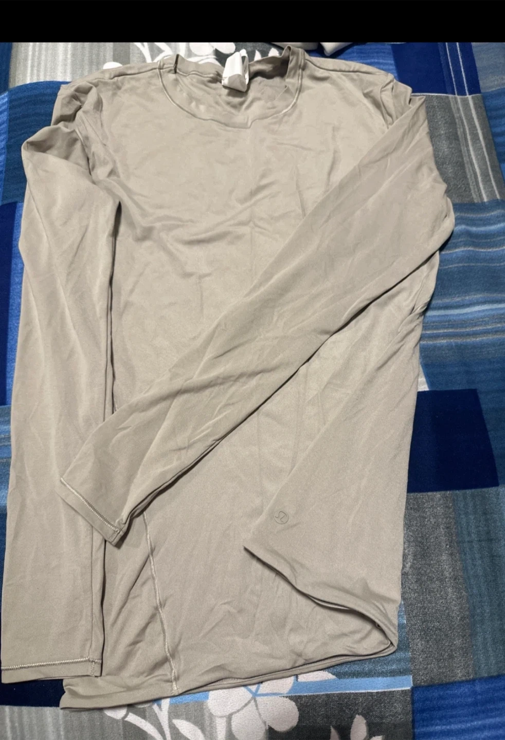 Selling a Lululemon long sleeve shirt. It's a neutral, light brown colour. The size isn't marked, but it's in good condition!