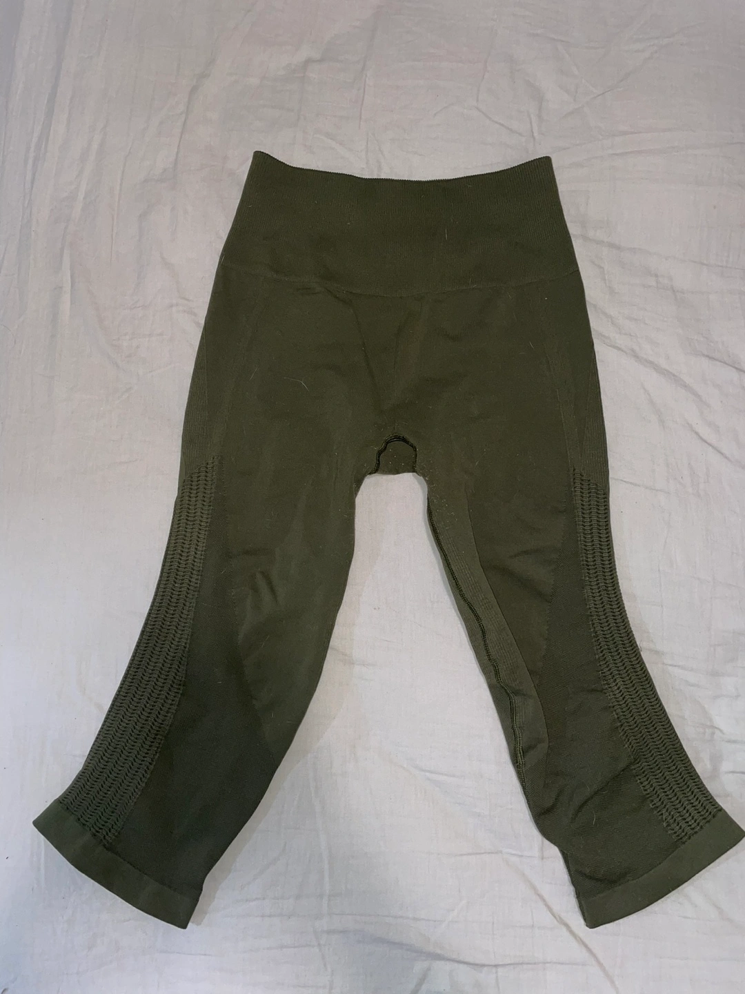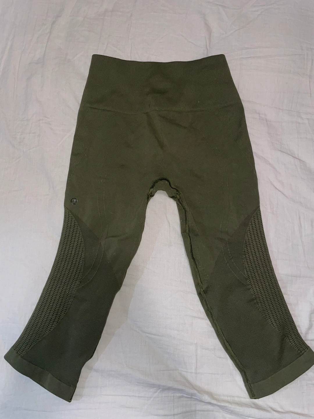Selling a pair of Lululemon cropped leggings in olive green! They're in good condition and perfect for workouts or just lounging around. They have a high waistband and are a nice, breathable material. Makes you look really nice! Not 100% on the size but I think 2-4, they’re a tighter fitting style.