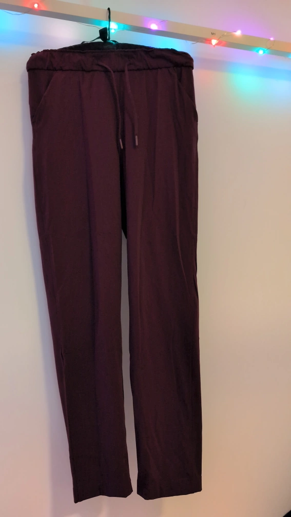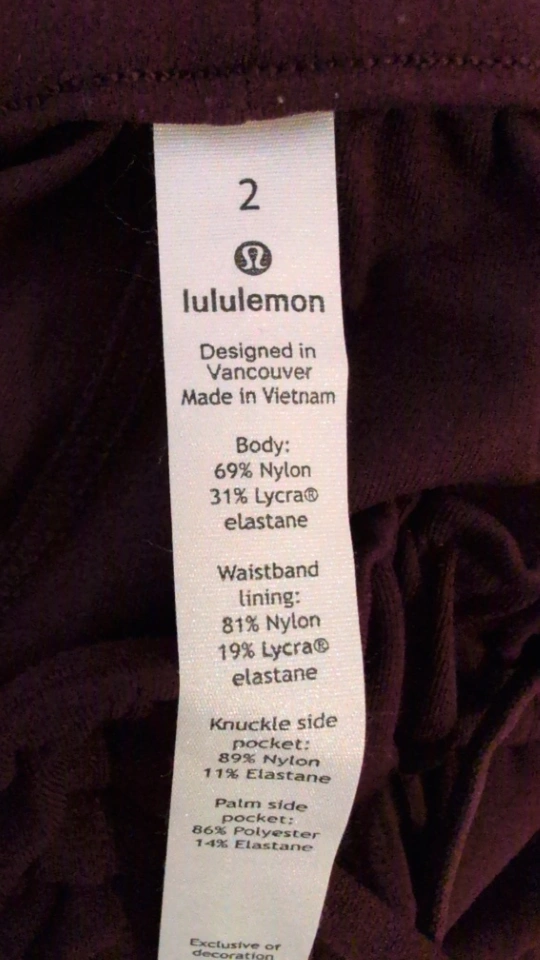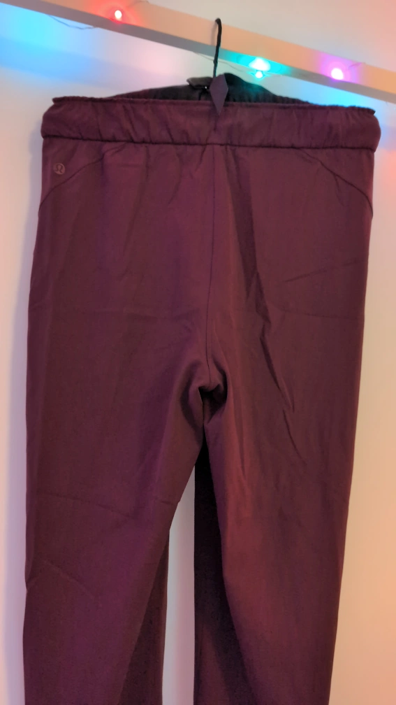 109Selling a pair of Lululemon pants in a lovely burgundy colour! They are a size 2 and made with a blend of nylon, Lycra elastane, and polyester. Perfect for workouts or just lounging around. Extremely comfy