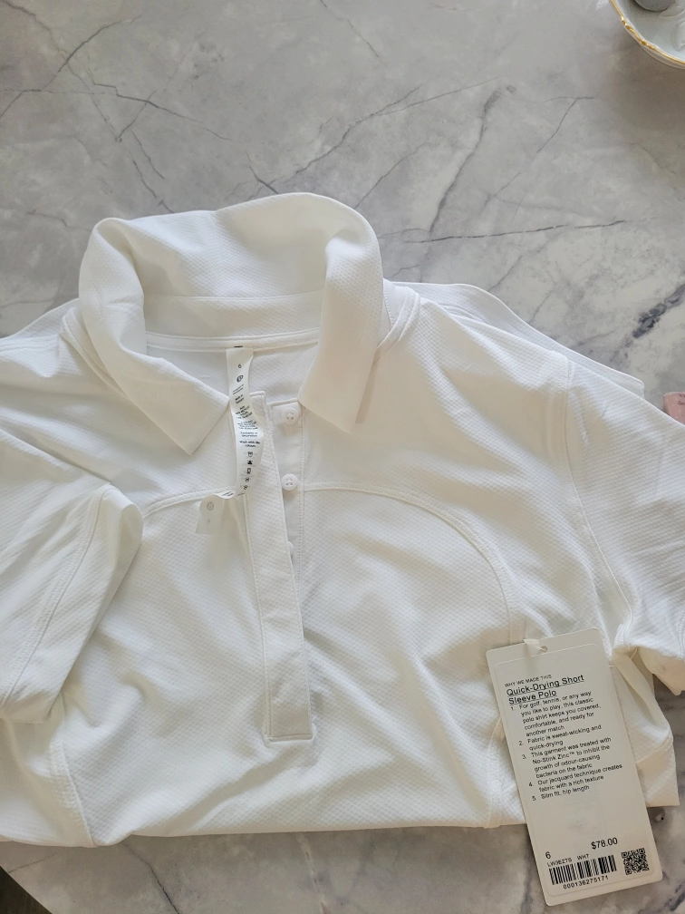 Looking to sell a Lululemon Quick-Drying Short Sleeve Polo in white, size 6! This polo is designed for golf, tennis, or any activity where you want to stay cool and comfortable. The fabric is sweat-wicking and quick-drying, so you'll feel great all day long. It also features No-Stink Zinc™ to inhibit the growth of odour-causing bacteria on the fabric. Originally bought for $78.00!