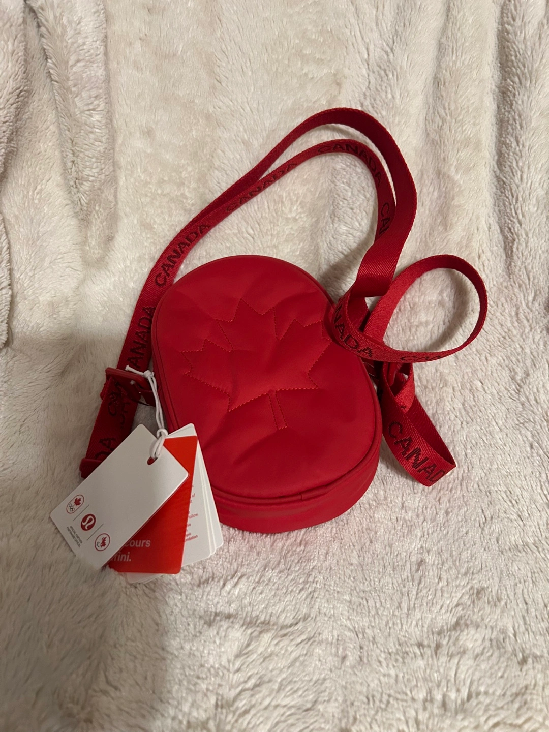 330Red crossbody bag. Features a quilted design and a Canadian maple leaf. Adjustable strap with Canada branding. New with tags. Part of the Lululemon x Canadian Olympic partnership.
