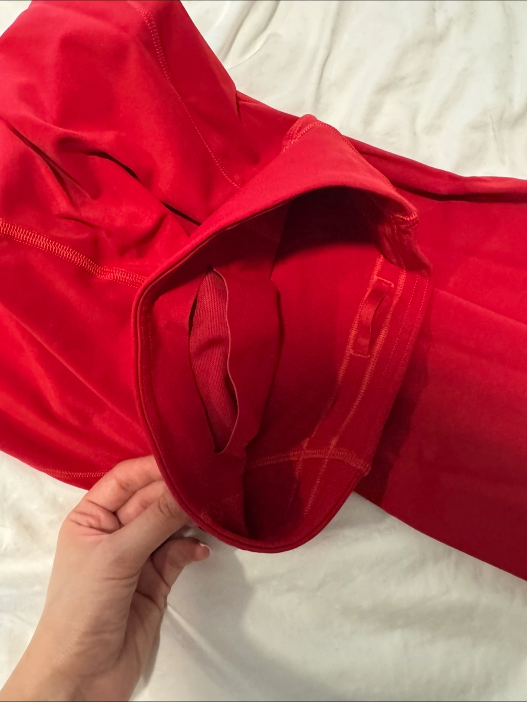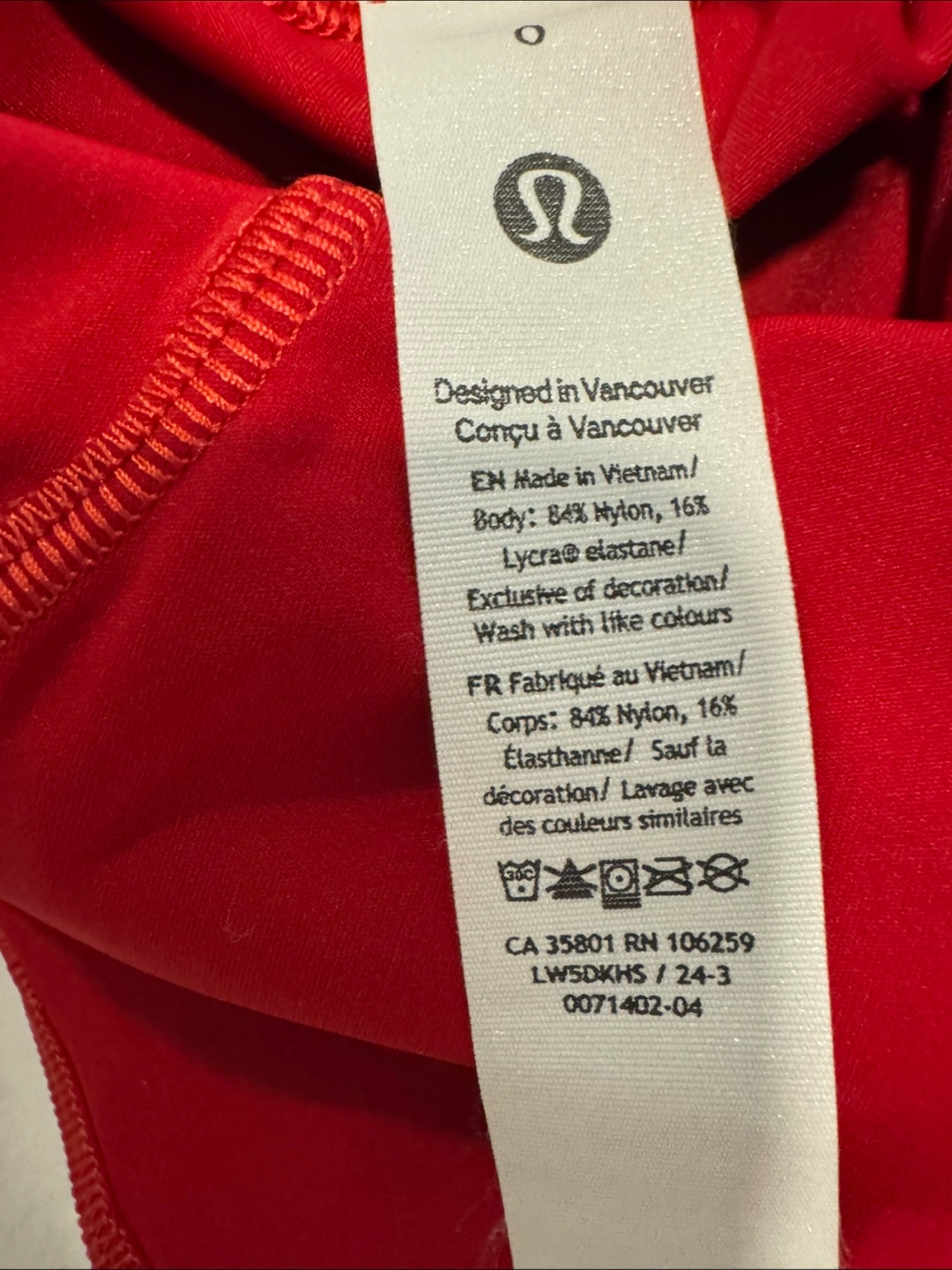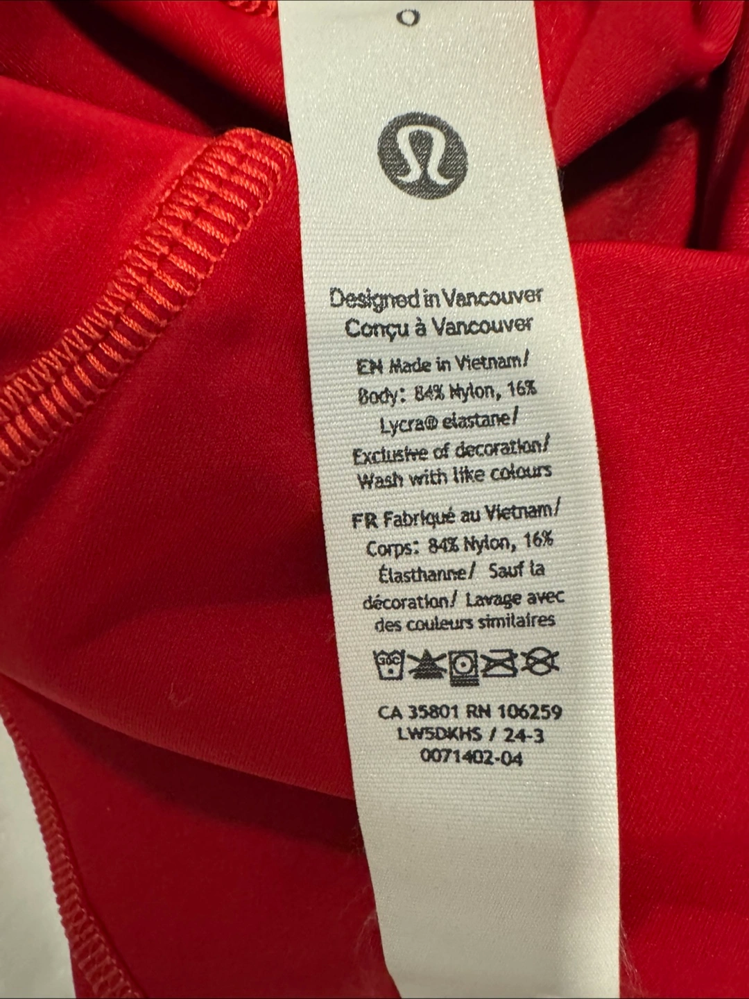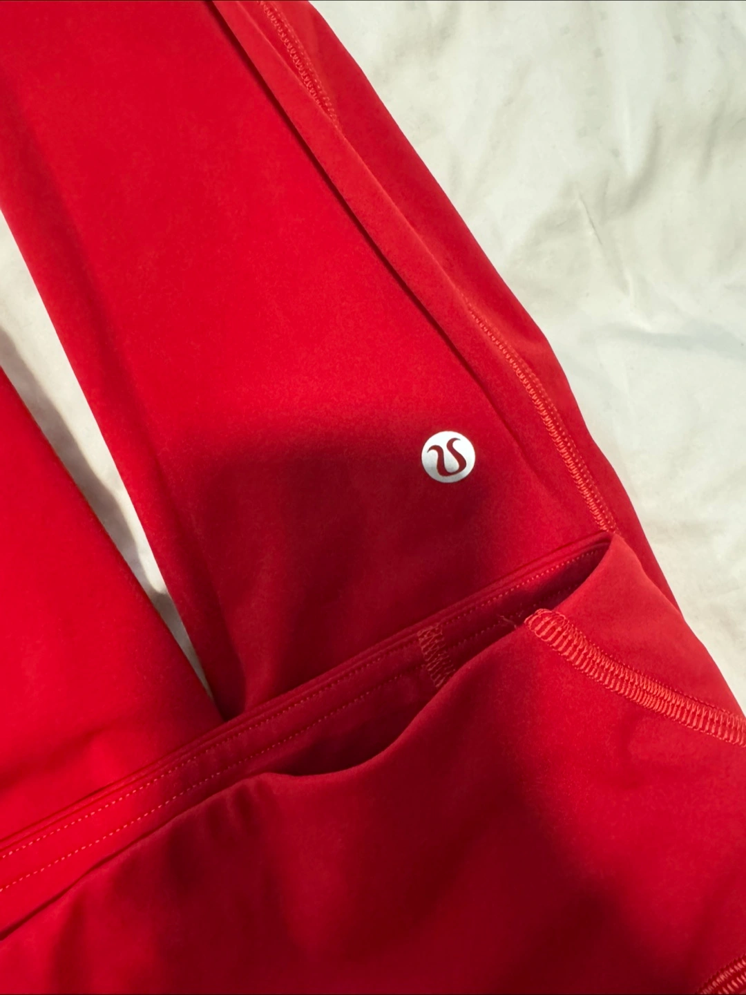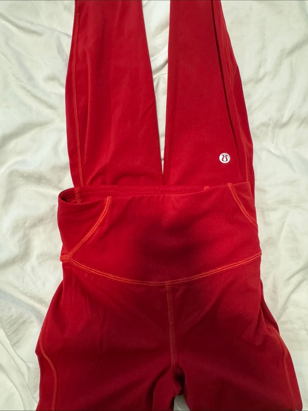 NEVER WORN Red Lululemon leggings. Size 0. High-waisted. Features pockets. Designed in Vancouver. Made in Vietnam. 84% nylon, 16% Lycra® elastane.