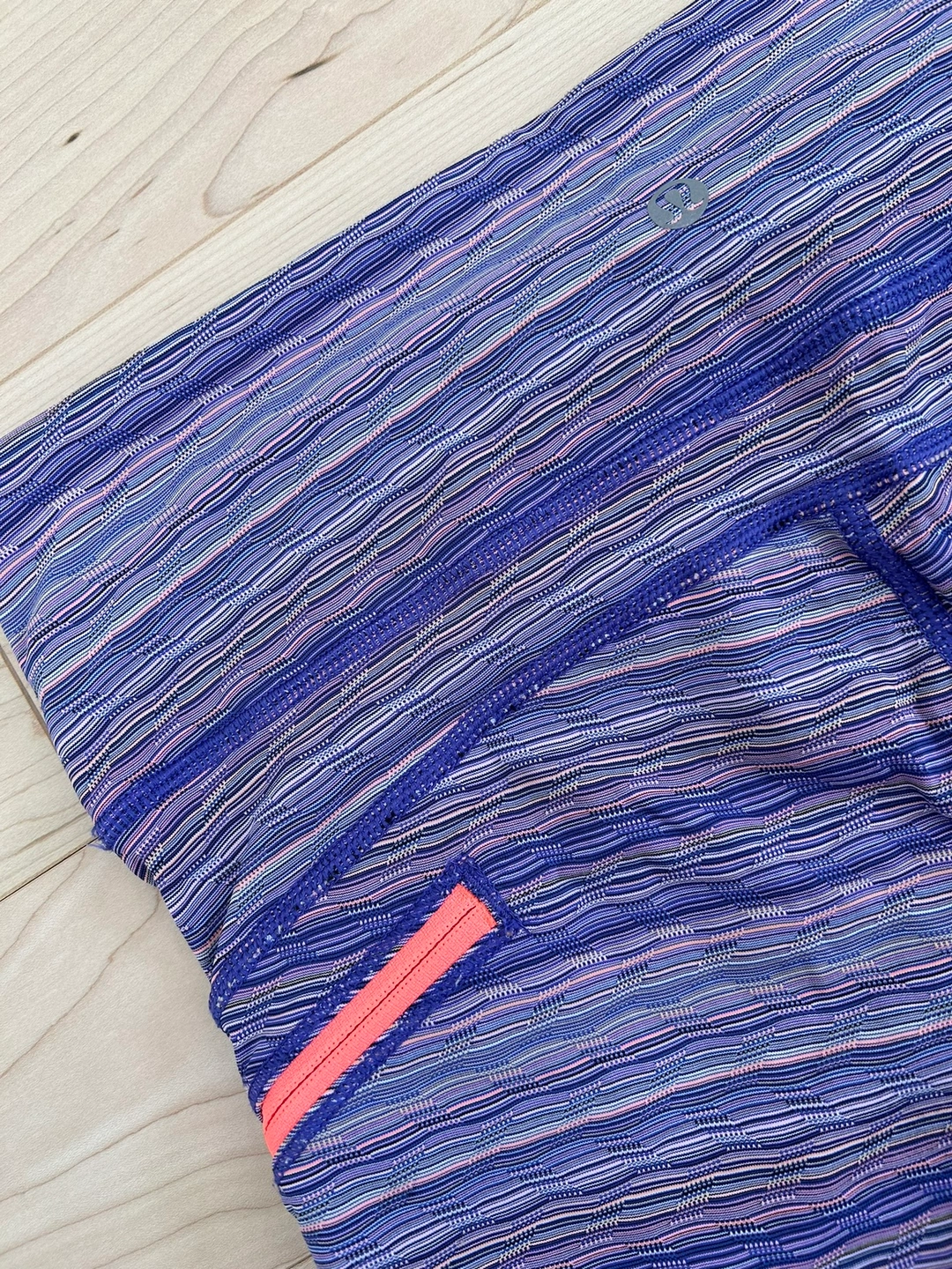 Lululemon Run: On The Fly Crop. Size 6. Mid rise Purple, pink, and blue striped pattern. Has side pockets.