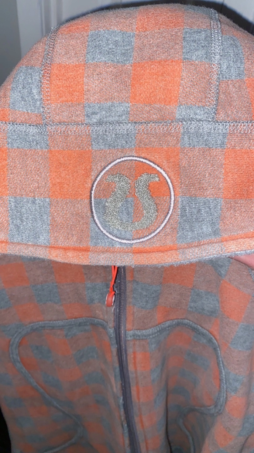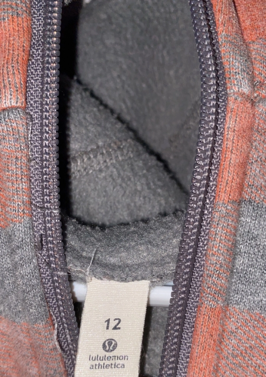 53Women's size 12 Lululemon scuba hoodie. Grey and orange plaid pattern. Full zip-up. Excellent condition.