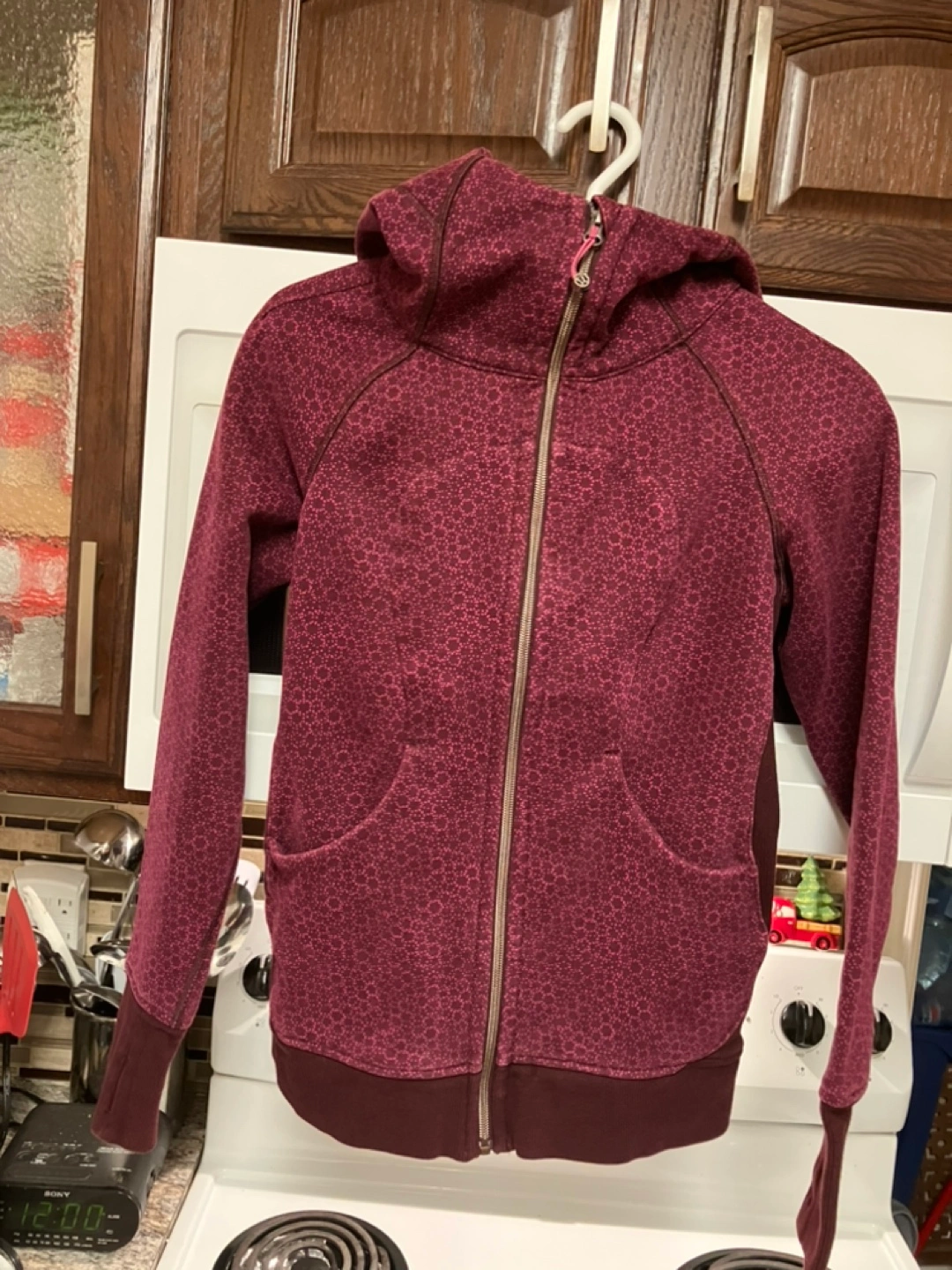 Women's zip-up hoodie. Burgundy colour with a subtle pattern. Size 6. Long sleeves