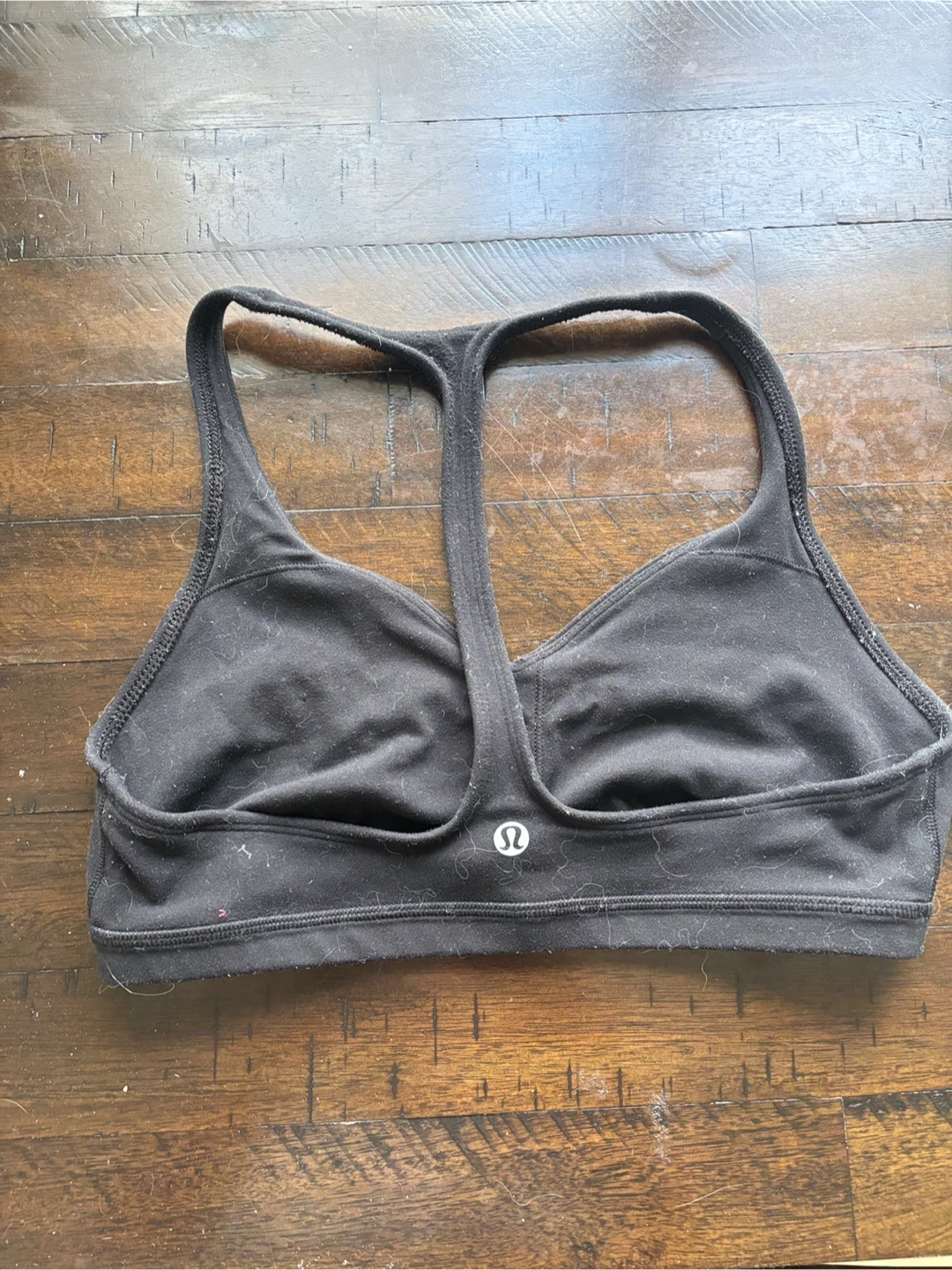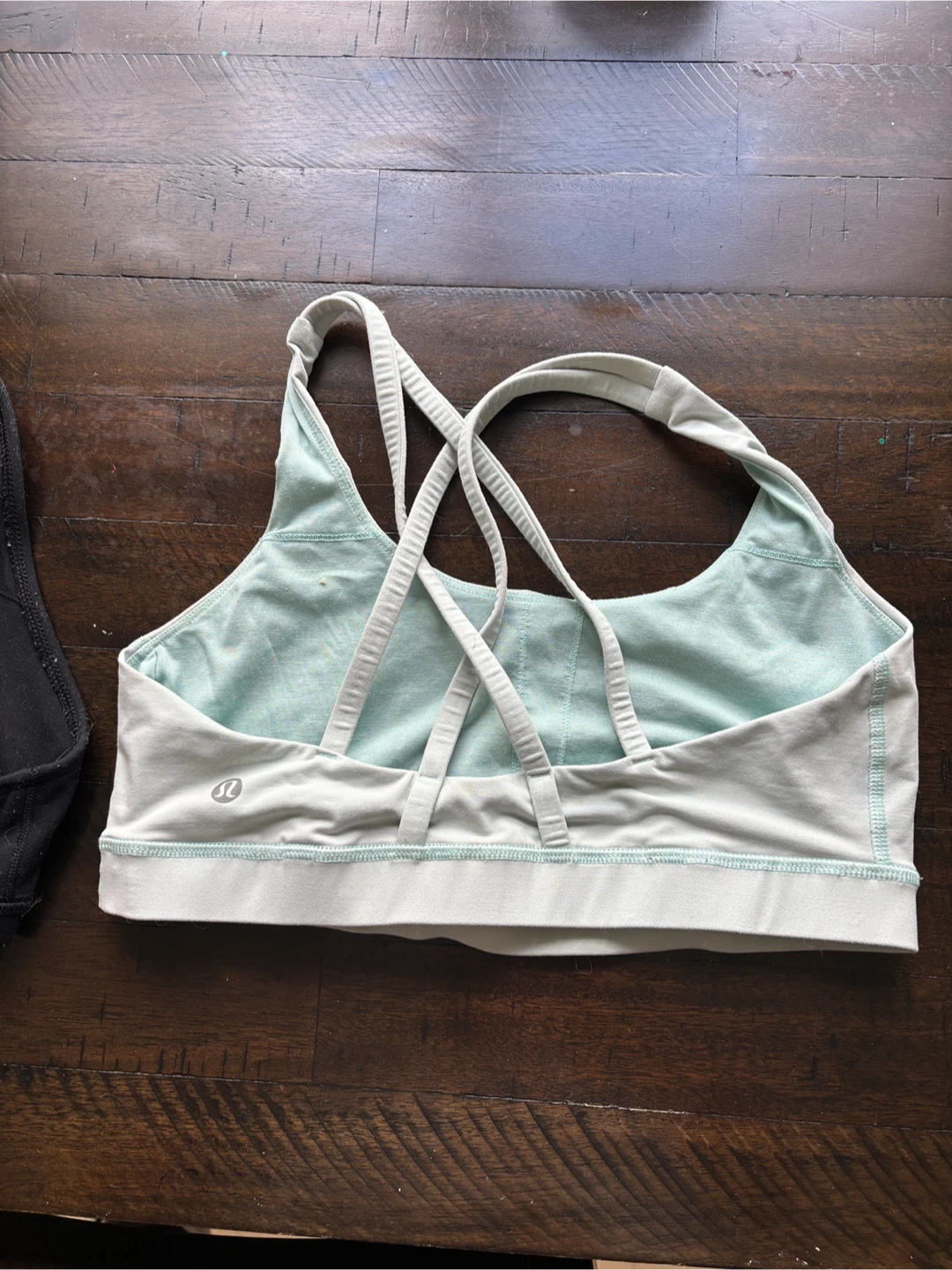 83Selling two Lululemon sports bras. One is light green/grey with a unique criss-cross back, and the other is black with a racerback design.