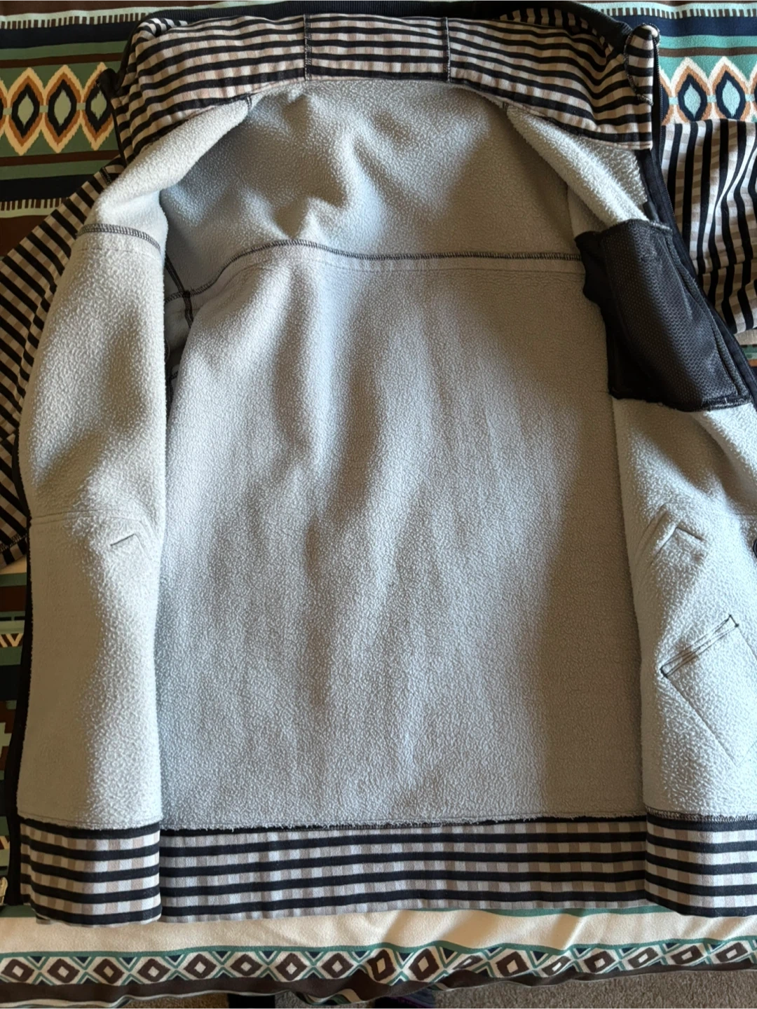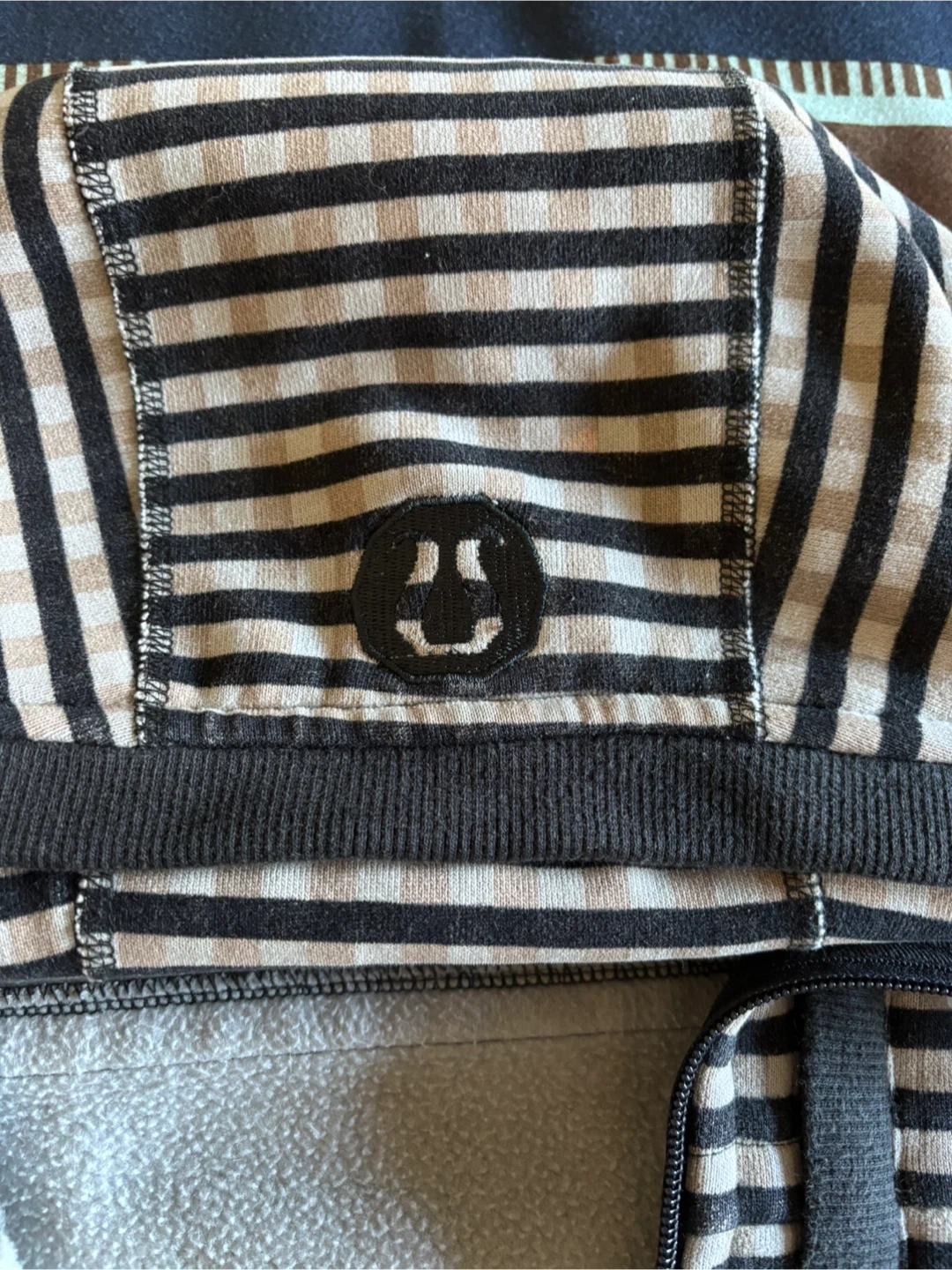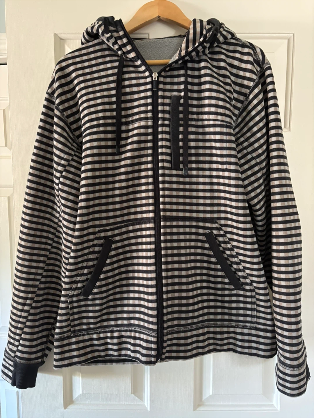 Cozy Lululemon hoodie with a striped pattern! It's in great condition and perfect for layering on cooler days. The fleece lining is super soft and comfy. It has a full zip and a hood for extra warmth.