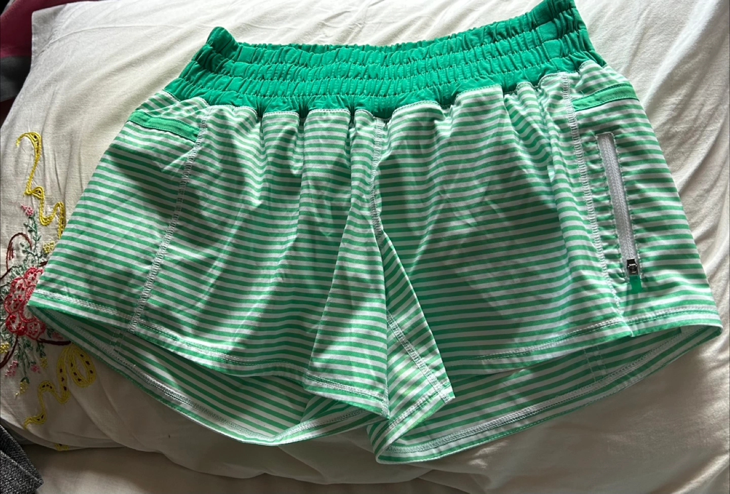 These are a pair of Lululemon running shorts in a fun green and white striped pattern. They have a comfortable elastic waistband and a zippered pocket on the side, perfect for holding your keys or phone while you're out for a run. Great for any workout or casual wear!