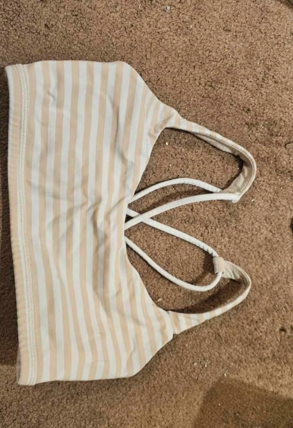 15Selling lulu striped sports bra. It features a beige and white striped pattern with a strappy back. Great for workouts or everyday wear!