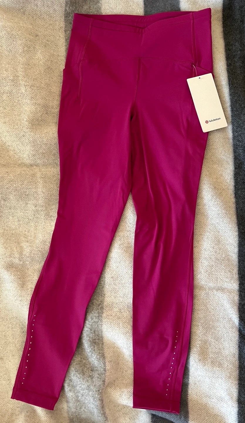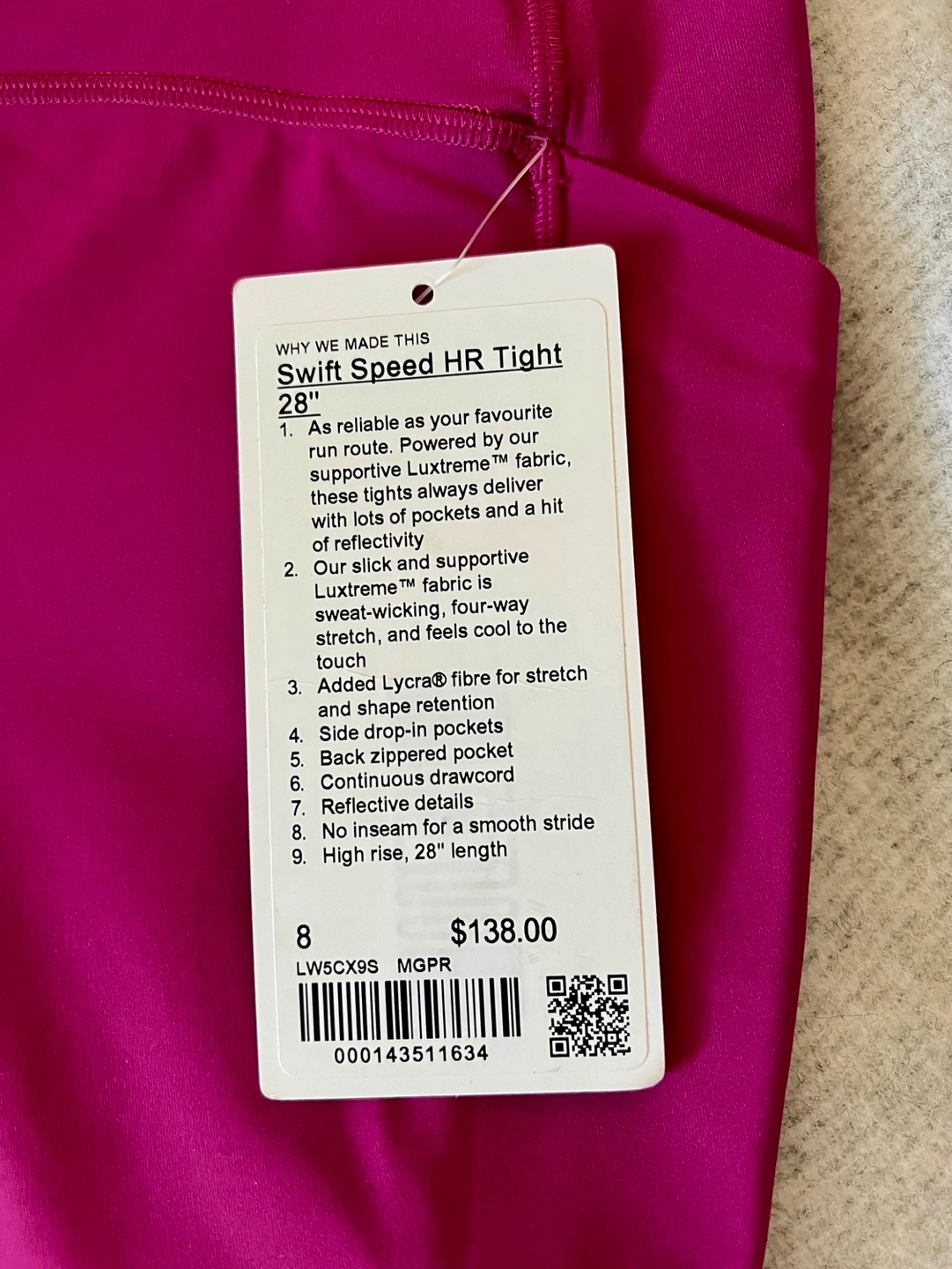 128Lululemon Swift Speed HR 28” Tight. Size 8. Magenta. High-rise. Pockets. Reflective details. Excellent condition. Pick up in Vancouver