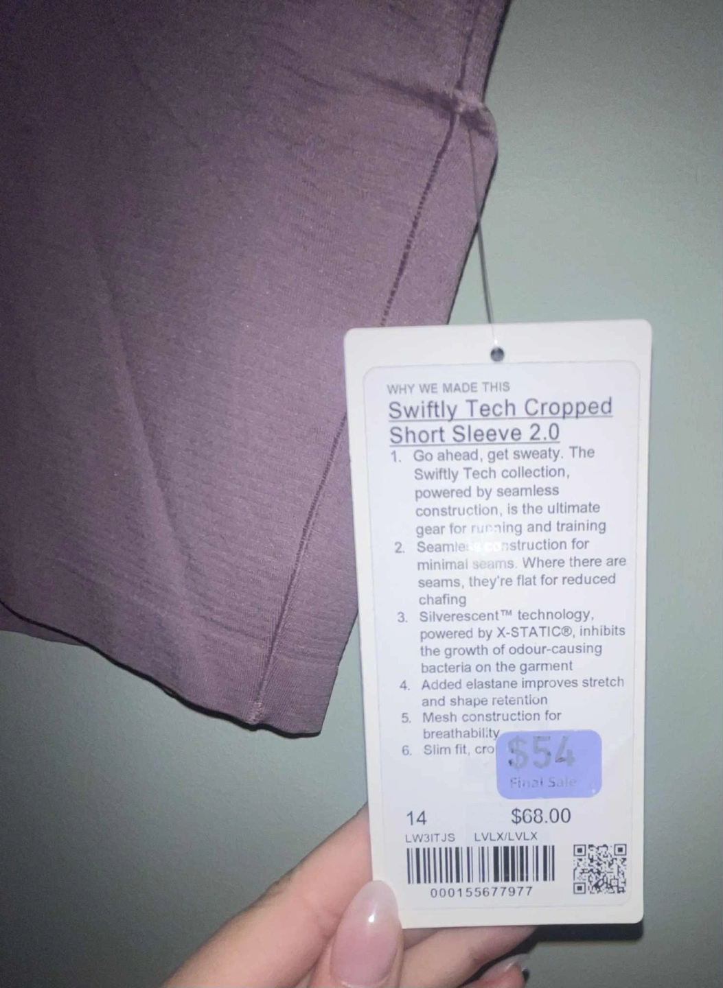 Lululemon Swiftly Tech Cropped Short Sleeve 2.0 New with tags Size 14 Colour LVLX / lavender lux $35 All sales are final no refunds. Pickup only.