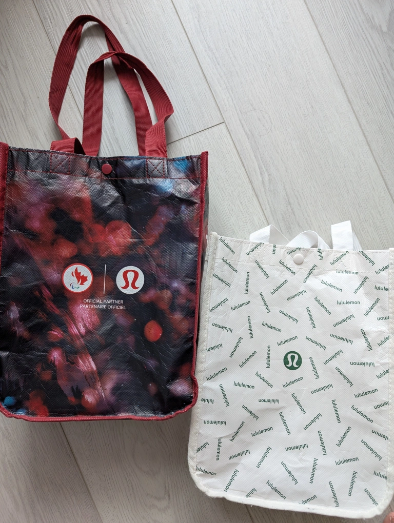 Selling two Lululemon tote bags! One is a red-accented bag with the official 2024 Olympics Canadian partner logo, and the other is more recent a white and green bag covered in the Lululemon logo. Great for shopping or carrying your gear to the gym or a lunchbox to work. $5 each or $6 for 2.