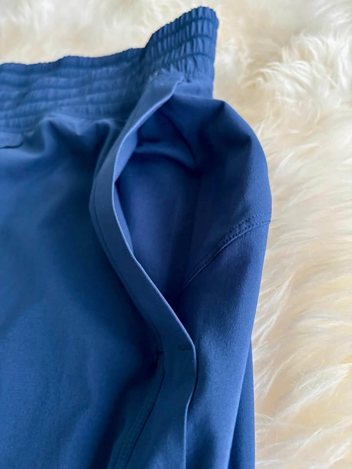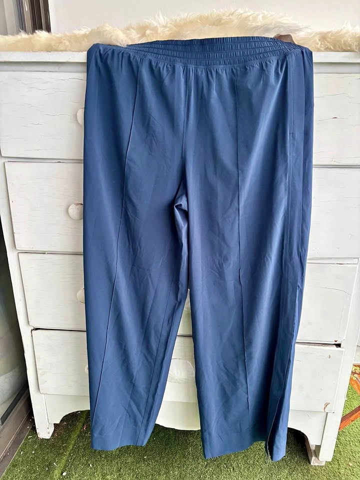 15Never worn, no tag. Size 14. Elastic waist, lightweight, sweat-wicking, four-way stretch. Medium rise, relaxed fit. Split seam by ankles. Great for travel. Navy blue.