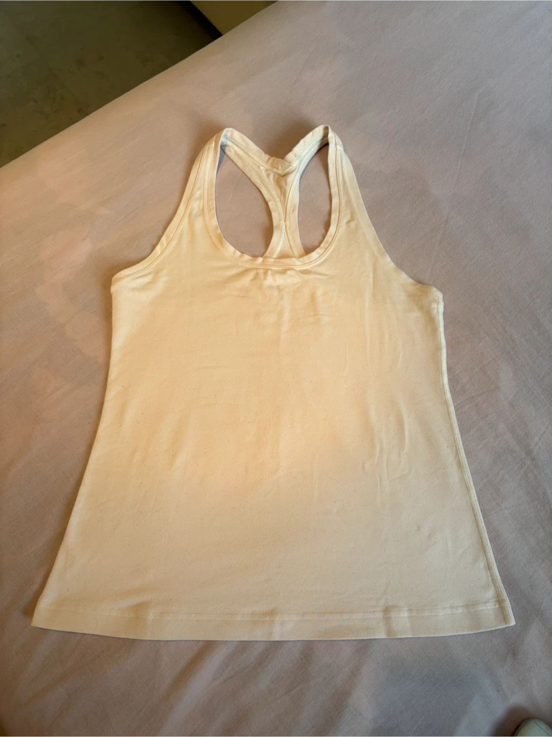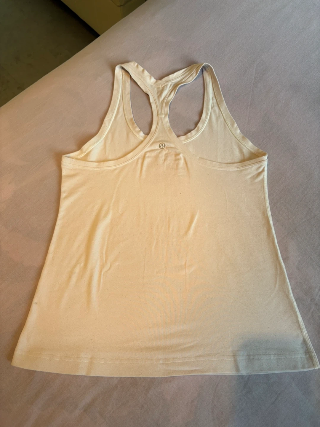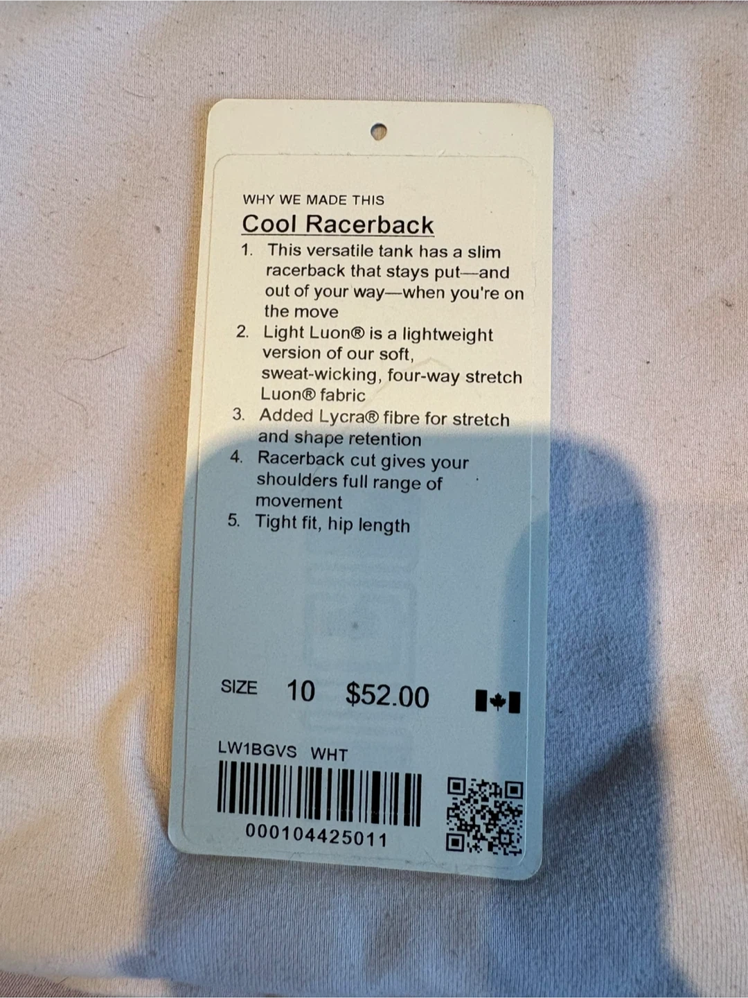 46Selling a Lululemon Cool Racerback tank in size 10, good condition. It's a versatile white tank with a slim racerback that stays put. The fabric is a lightweight, sweat-wicking, four-way stretch Luon fabric with added Lycra fibre for stretch and shape retention. The racerback cut gives your shoulders a full range of movement, and it has a tight fit with hip length.