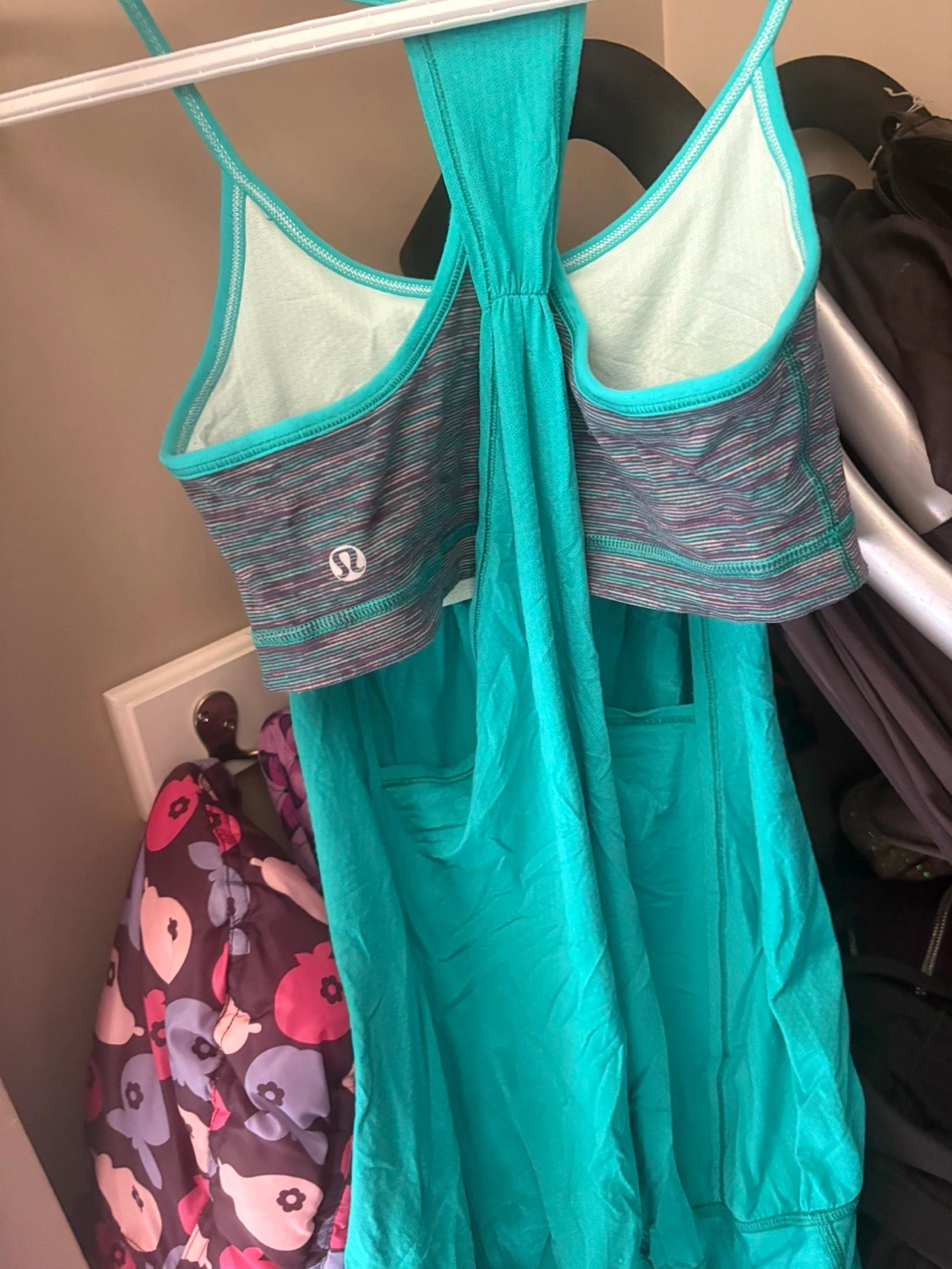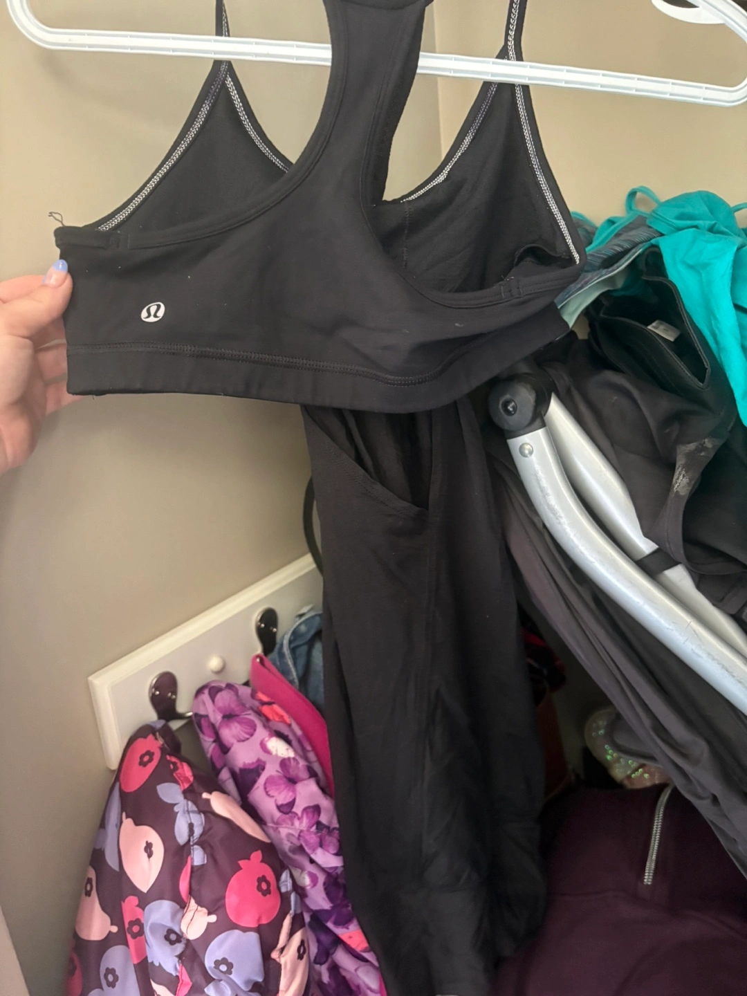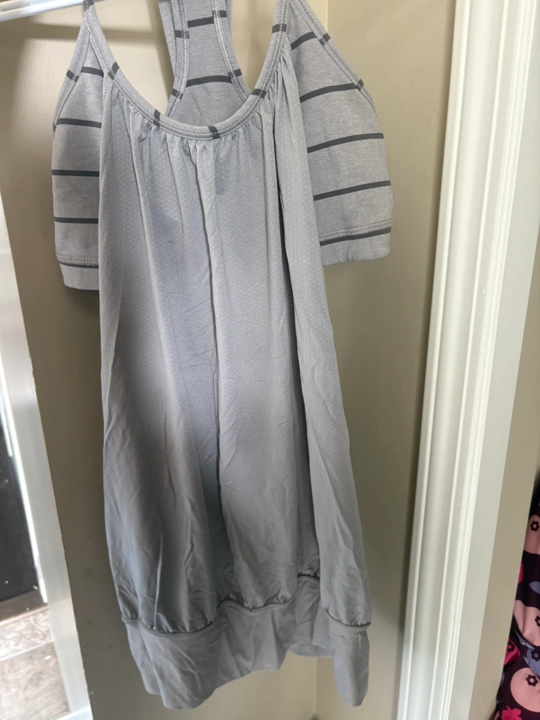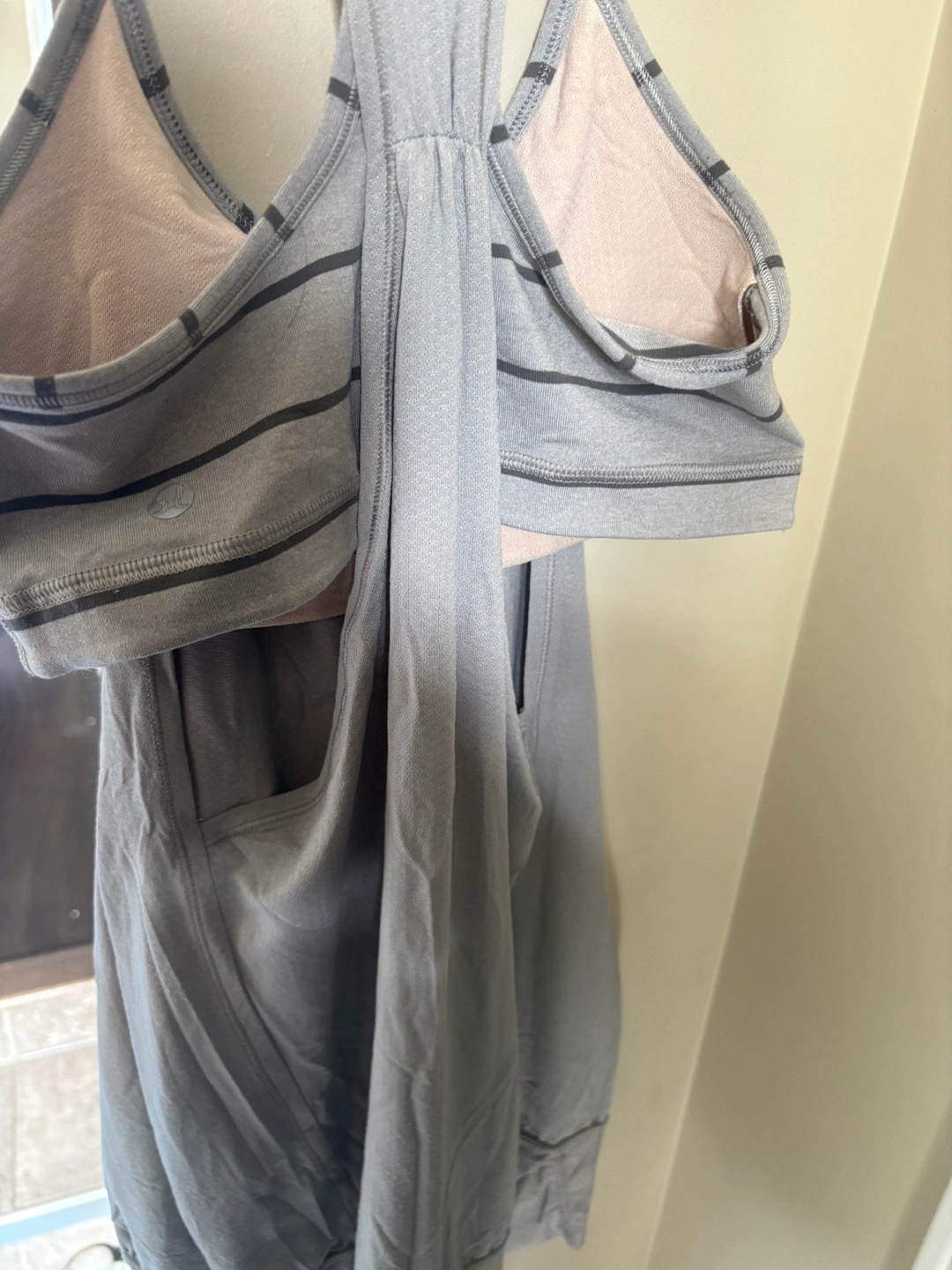 A comfortable, well-designed tank top. Has a built-in sports bra, too. A great choice to wear for any workout and makes for a relaxing piece to lounge in after a long day. Teal grey and black