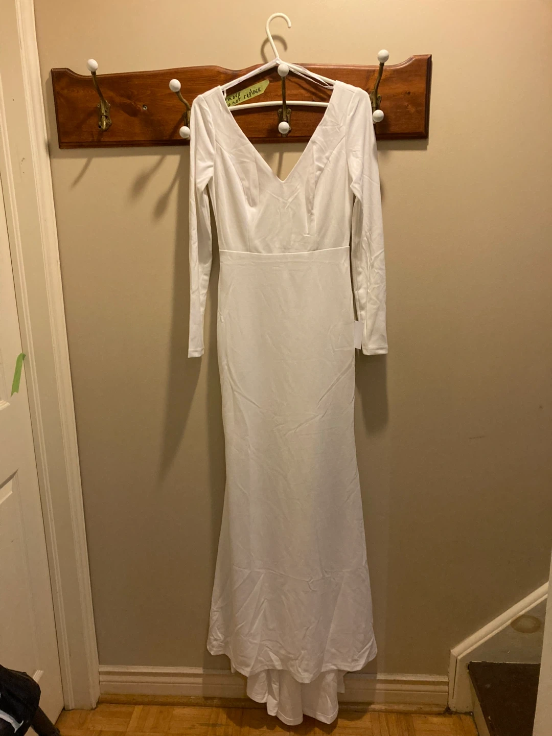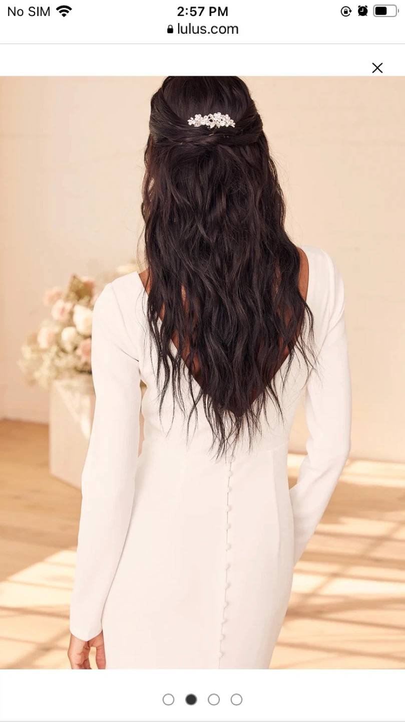 60Selling a beautiful white long sleeve maxi dress from Lulus! It's in great condition and perfect for a special occasion. The dress features a flattering V-neckline and a sleek, elegant silhouette. It's a size small. It’s Brand new. Original price is 240 dollars , in selling for 150. Reason for selling: I didn’t wear to my wedding because the cut at the back is to low for me.Still have the tag.