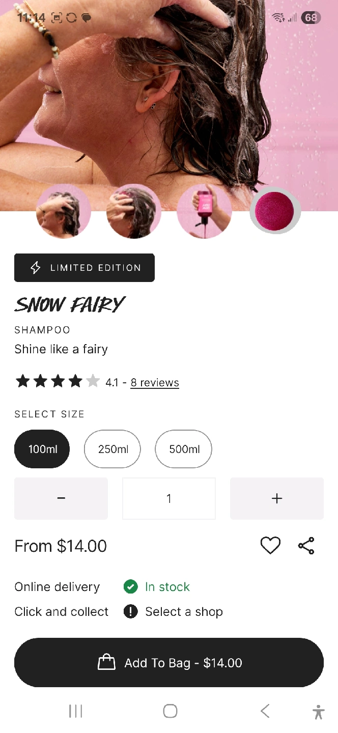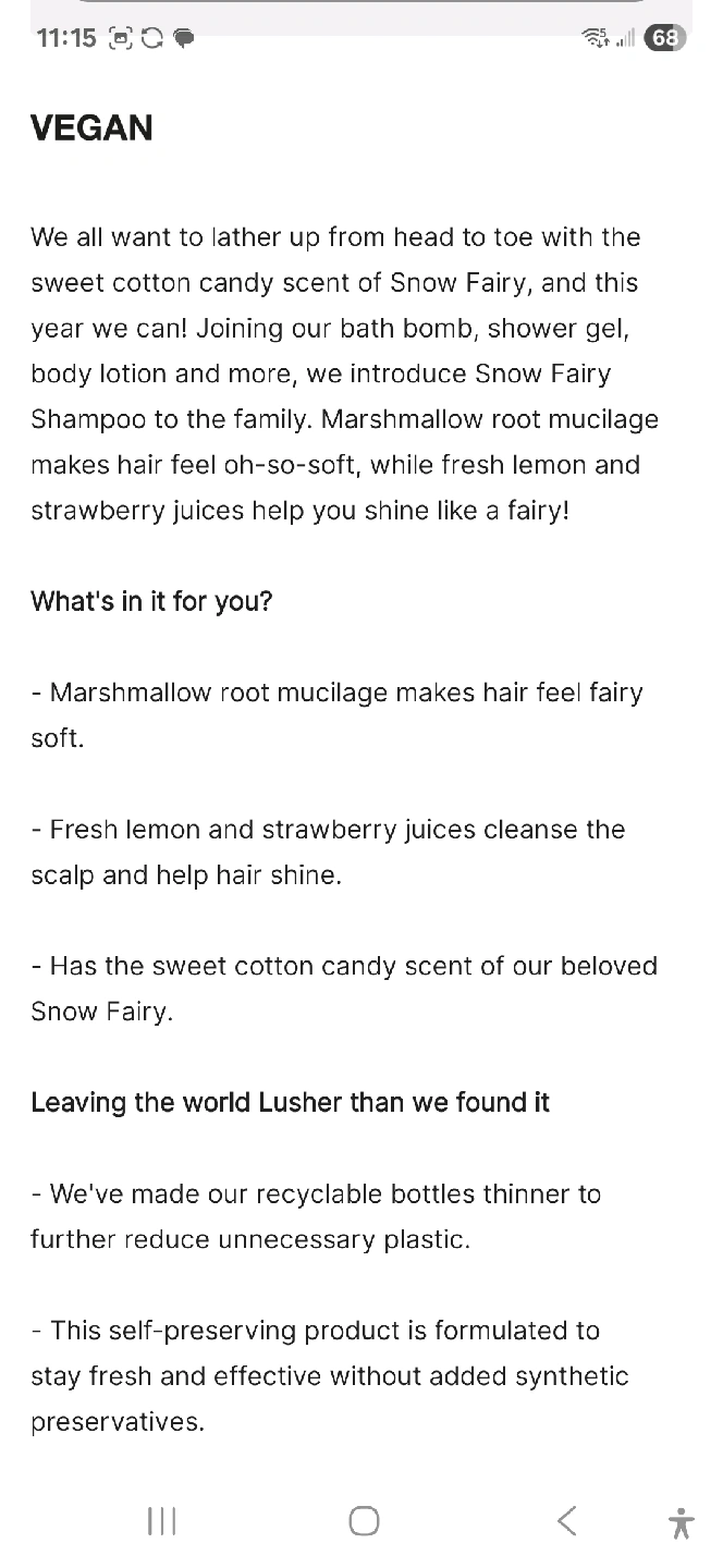84Selling a bottle of Lush Snow Fairy shampoo. It's the 100ml size and smells like sweet cotton candy! It makes hair feel fairy soft and shiny with marshmallow root infusion and fresh strawberry juice