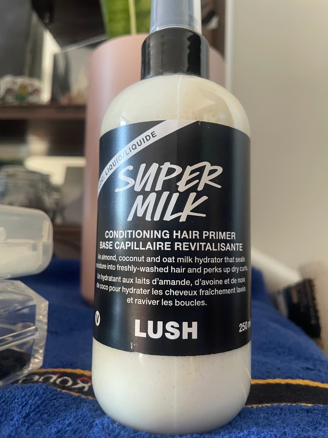 Lush Super Milk Conditioning Hair Primer. 250ml and used a few times. It's a base capillaire revitalisante with almond, coconut, and oat milk to seal moisture into freshly-washed hair and perk up dry curls. The expiration date is 29/Jan/2026