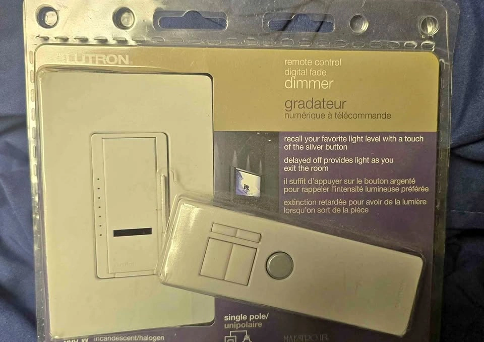 10Lutron's Maestro IR Dimmer and remote to adjust your lights from anywhere in the room, up to 30 ft. Dim the lights to watch television, or bring them up to full brightness for reading, without leaving the comfort of your couch. The Maestro IR Dimmer includes all of the features of a Maestro Dimmer, including delayed fade-to-off, which can be activated using your hand held remote or directly at the dimmer. The delayed fade-to-off gives you 10-60 seconds to leave the room or get into bed before the lights go out. You can also recall your favourite light level with a touch of the silver button on your remote, or by using the tap switch on the dimmer. The LEDs on the Maestro IR Dimmer display the light level and glow softly in the dark, so you can easily find the control. Wherever you want to relax and control your own lighting environment, you will want Maestro IR dimmers. This kit includes the Maestro IR dimmer, handheld infrared remote and the matching Claro wall plate. Use the silver button on your remote to recall your favourite light level Lights fade up and down smoothly allowing your eyes to adjust Controls your lighting fixtures via remote control Remote works up to 30 ft. from the Maestro dimmer must be in line of sight For use with incandescent and halogen bulbs only Includes Maestro IR dimmer IR remote control and Claro wall plate