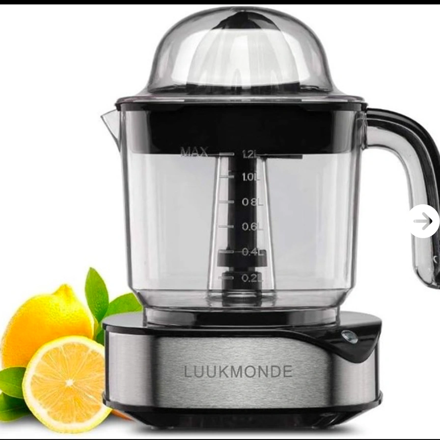 citrus juicer. Features a transparent container with measurement markings. Stainless steel base. Easy to use and clean.