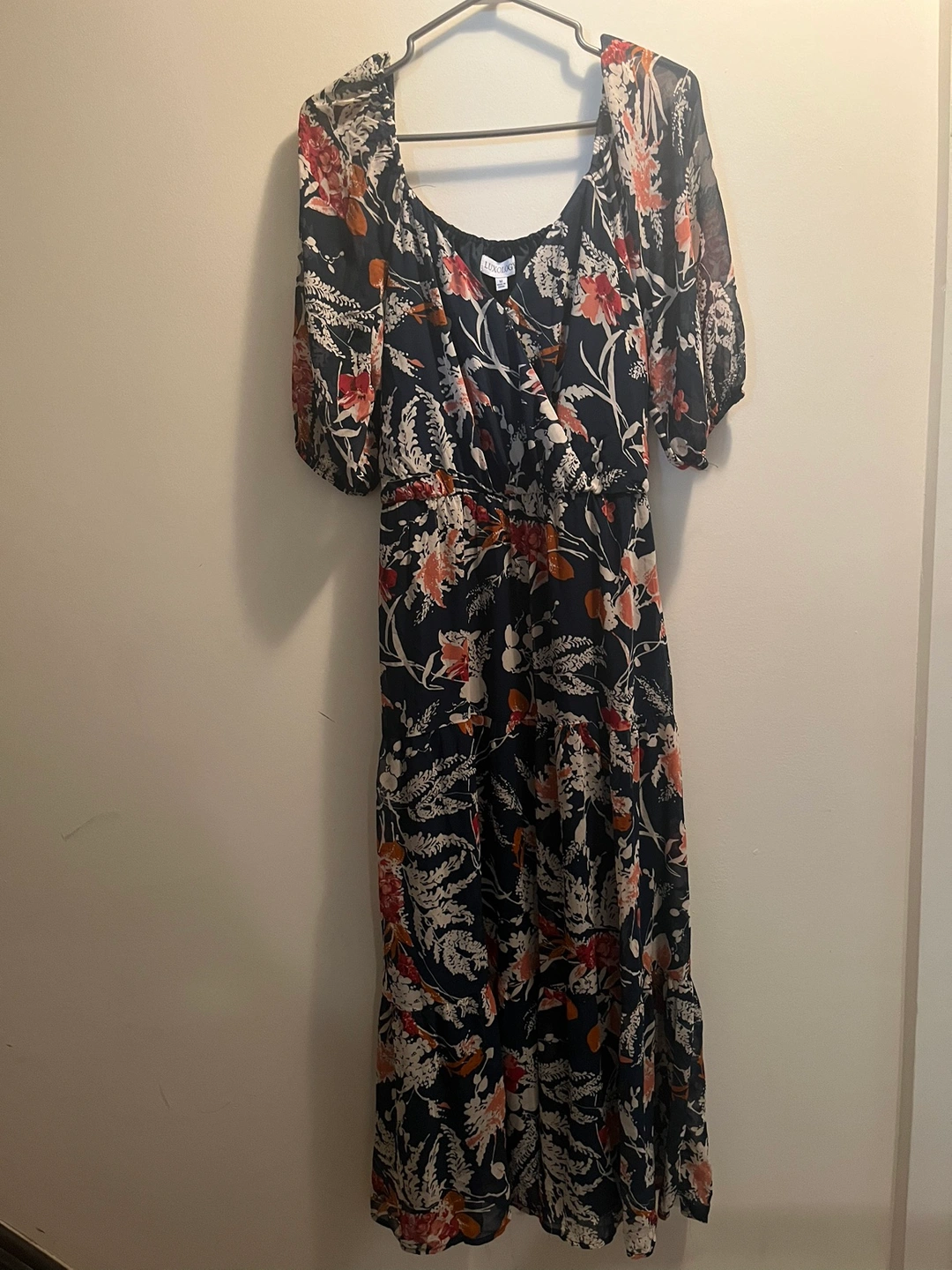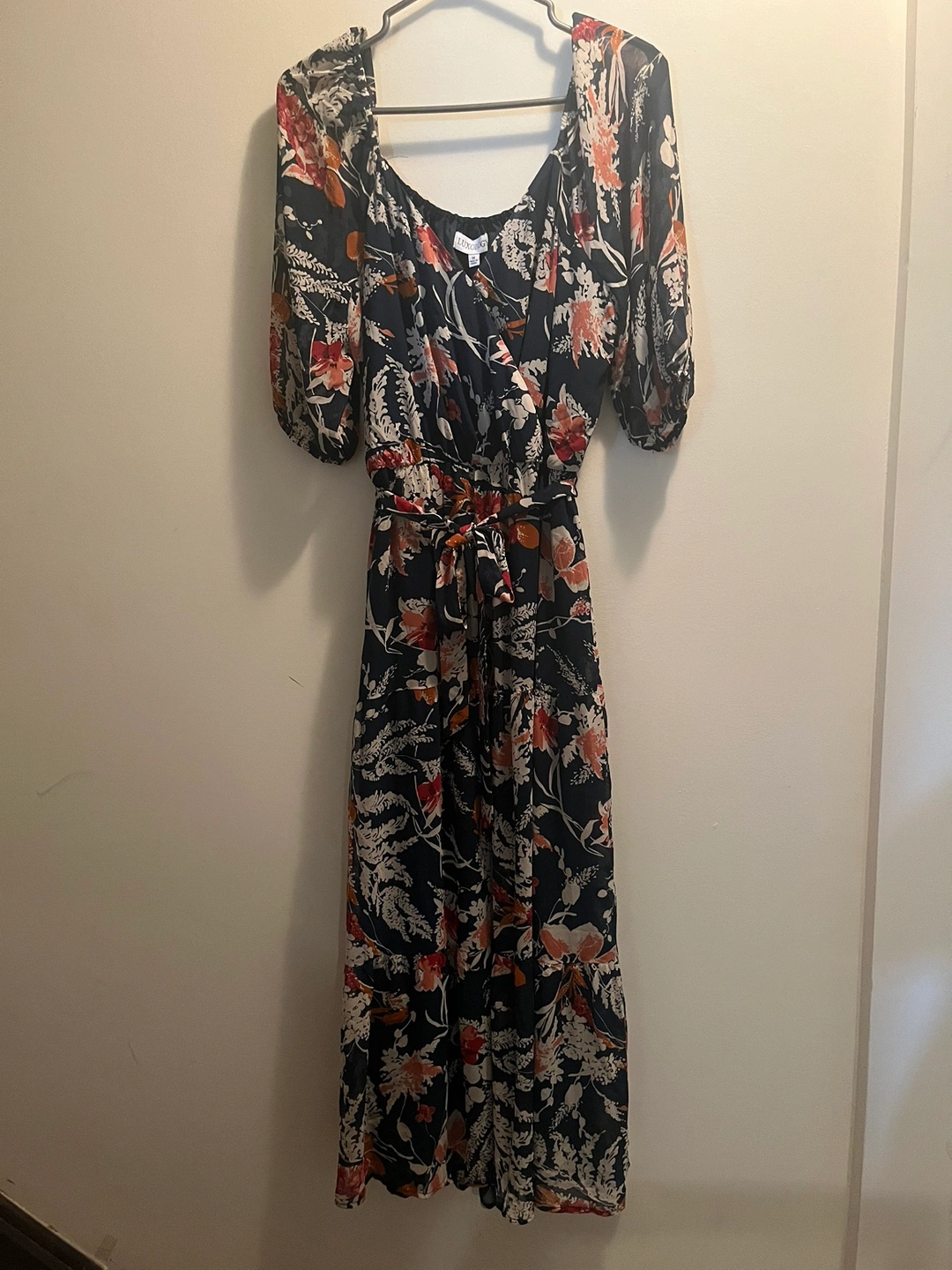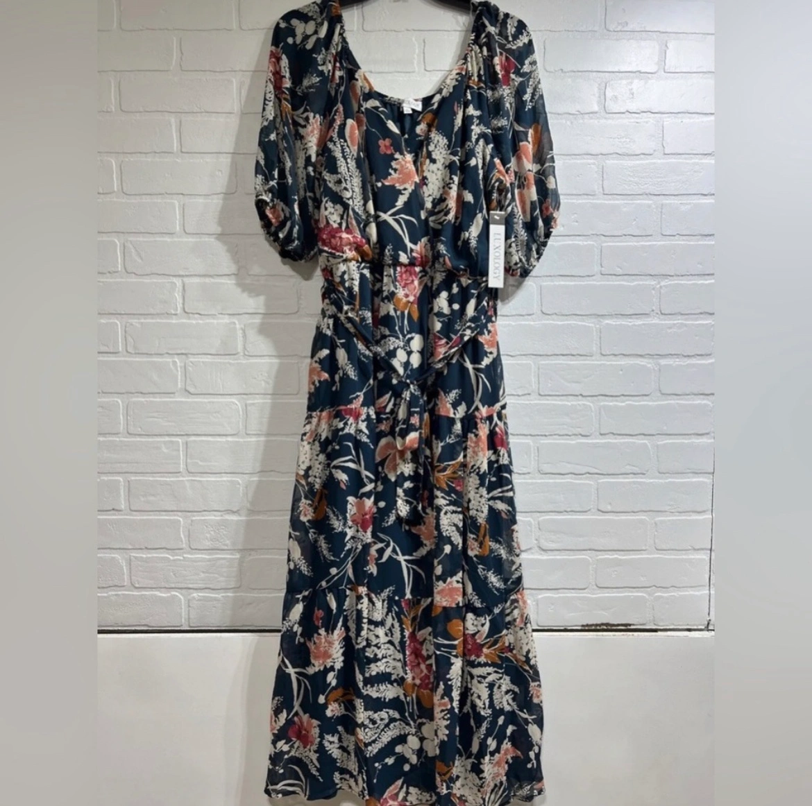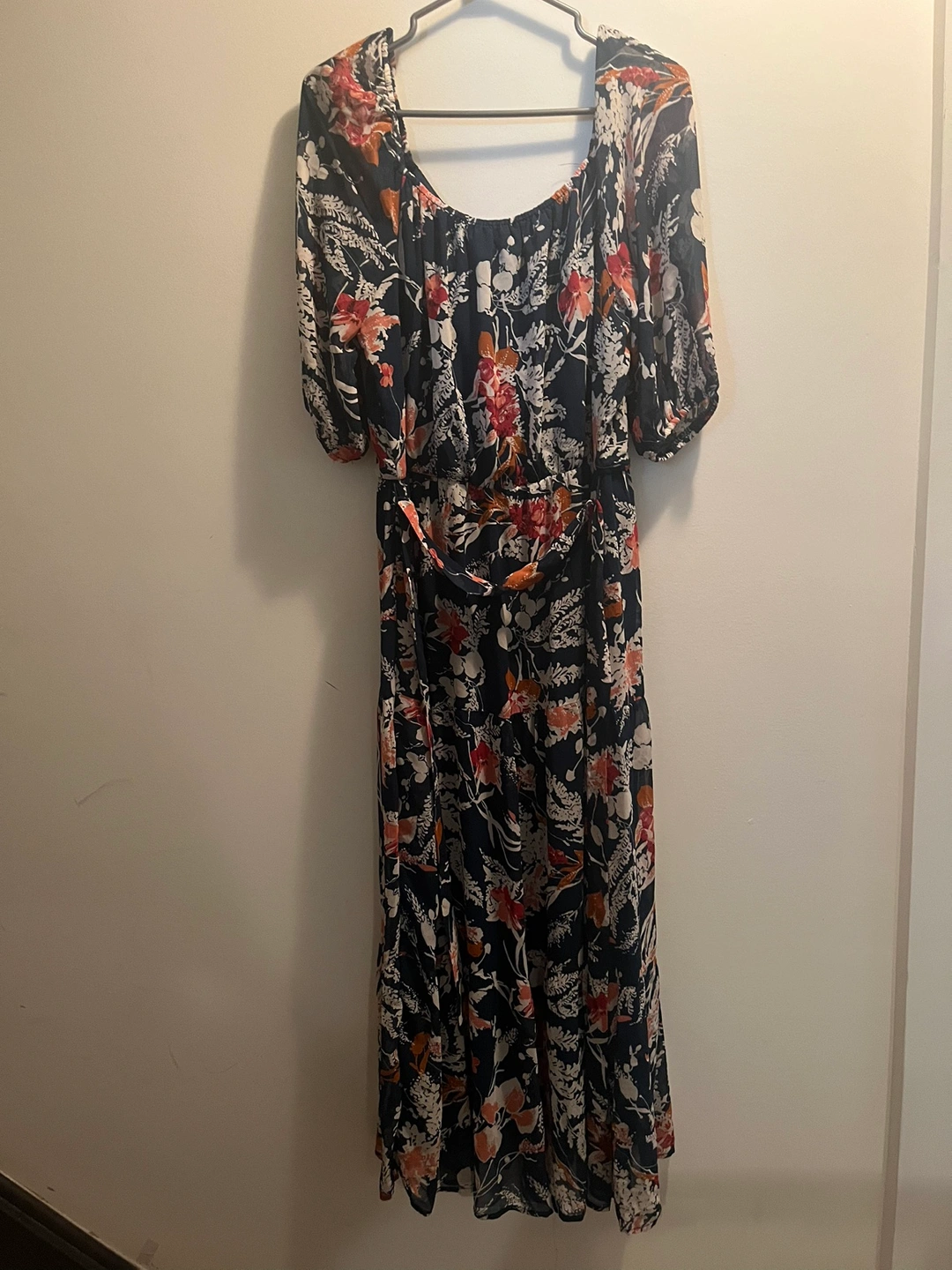 Brand new Pickup Brampton or downtown Toronto Approx measurements pictured laid flat Approx Ptp WITH STRETCH is about 25”-25.5” Approx waist WITH STRETCH is about 21” From website: FEATURES Fit & flare silhouette Chiffon construction Tiered hem No closure - pullover styling Elastic cuffs Puffed sleeves 3/4-length sleeves Coordinating belt Fully lined V-neck FIT & SIZING 56-in. length from shoulder to hem Maxi length hits at the ankle Elastic waistband FABRIC Body & lining: polyester