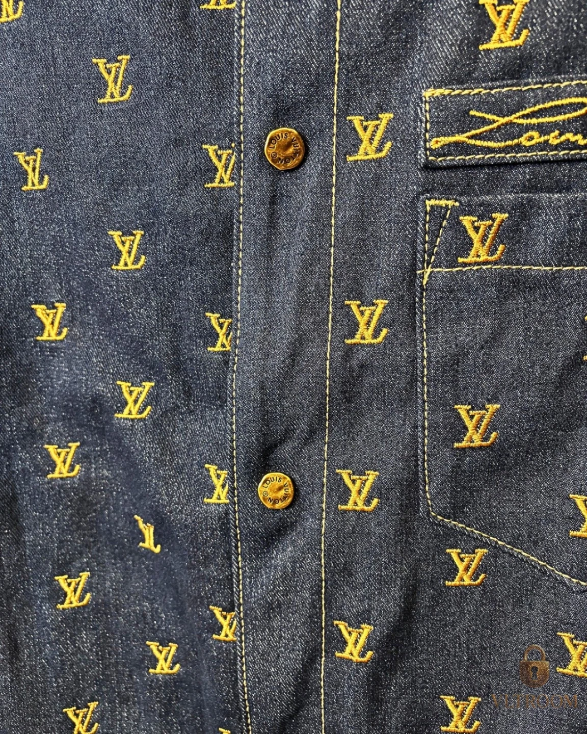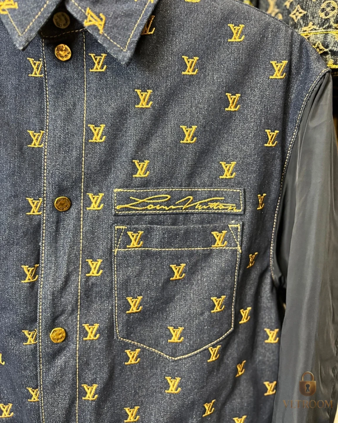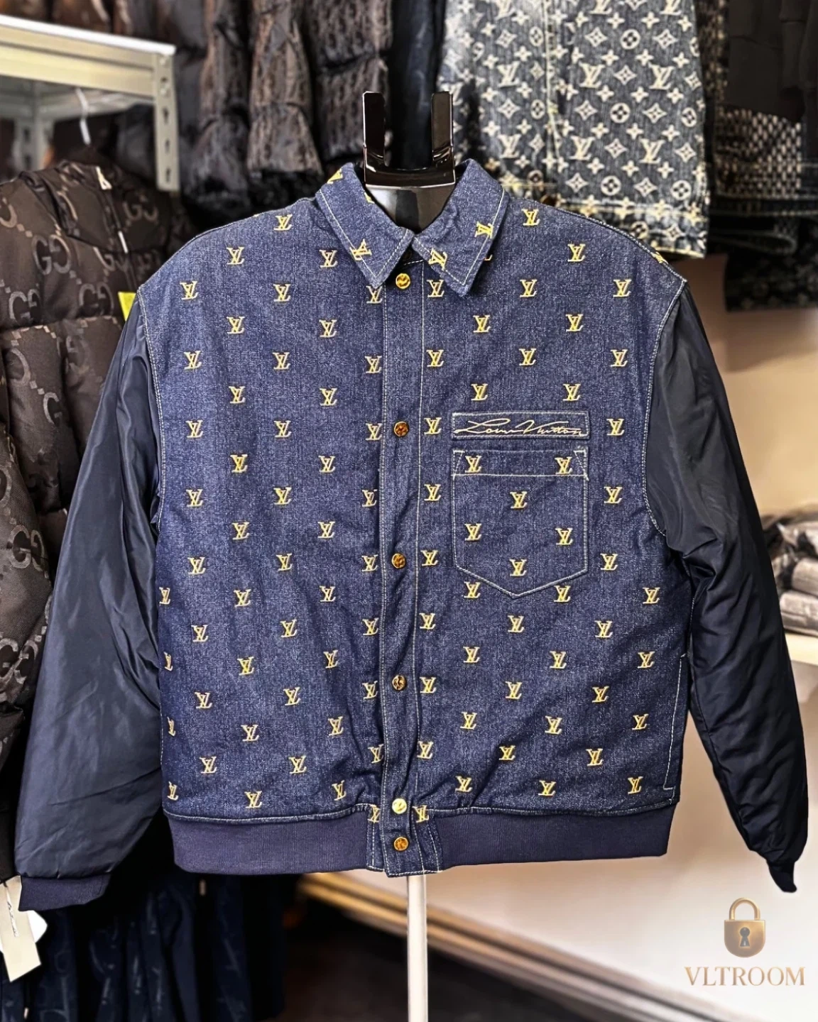 15Louis Vuitton Upcycled Denim Varsity Jacket Premium upcycled denim varsity-style jacket with full Monogram embroidery throughout. Structured, durable, and detailed with LV patchwork, contrast stitching, and metal hardware. Condition: Brand new Sizes Available: • 48 (Fits Medium) • 50 (Fits Large) DM for price, try-on, or pickup.